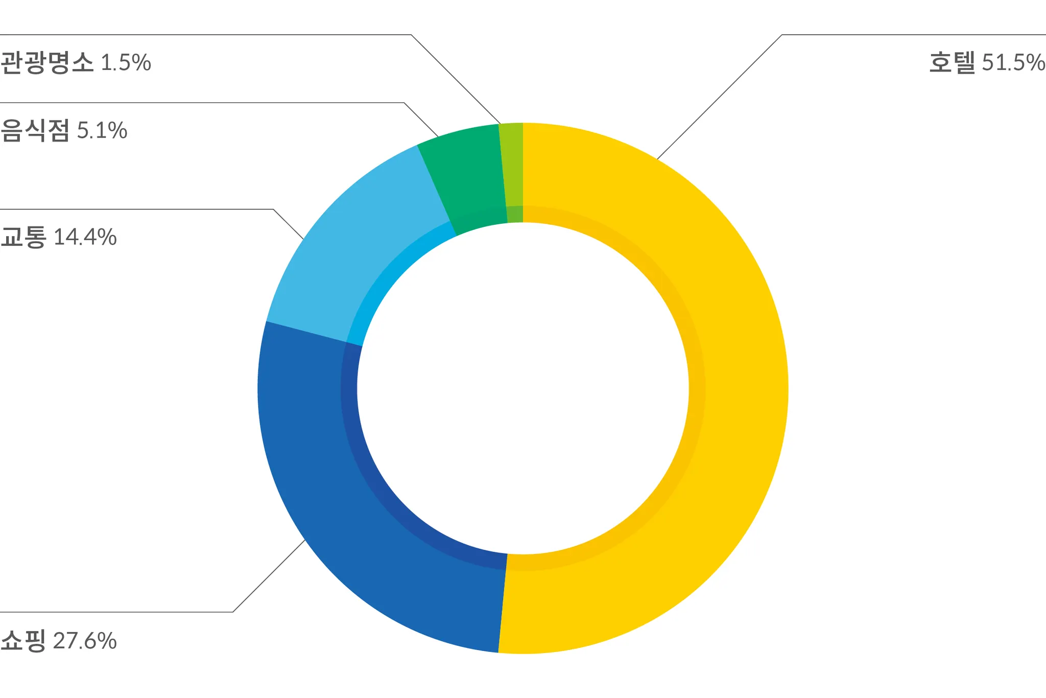그 외 카테고리에서는 교통이 14.4%로 세 번째로 높은 비중을 차지했다. 여행을 마치고 공항으로 갈 때 괌택시를 많이 이용하고 있는 것으로 나타났다. 음식점은 5.1%, 관광 명소 카테고리는 1.5%로 비교적 낮은 비율을 차지하였다.