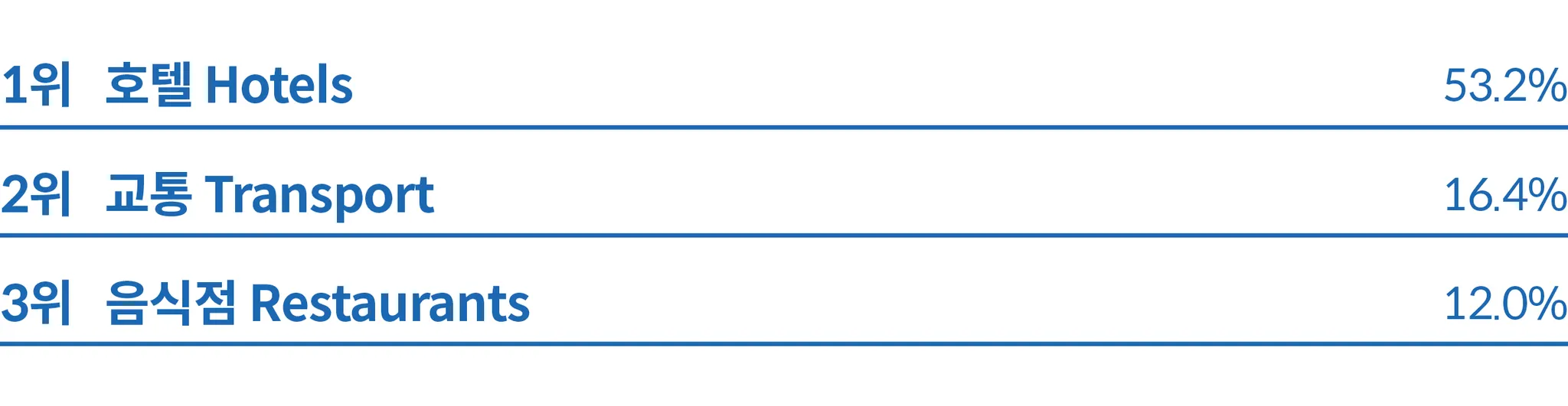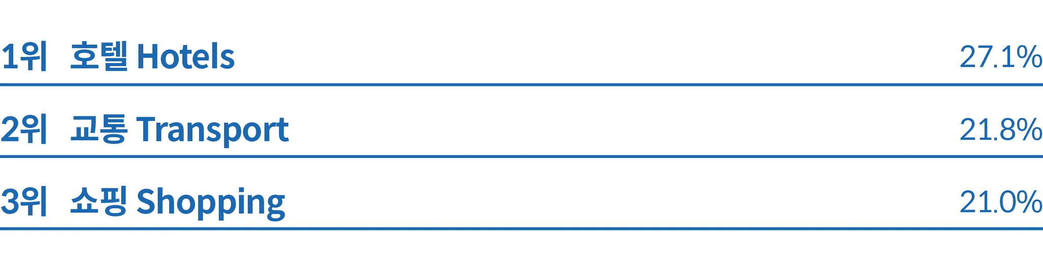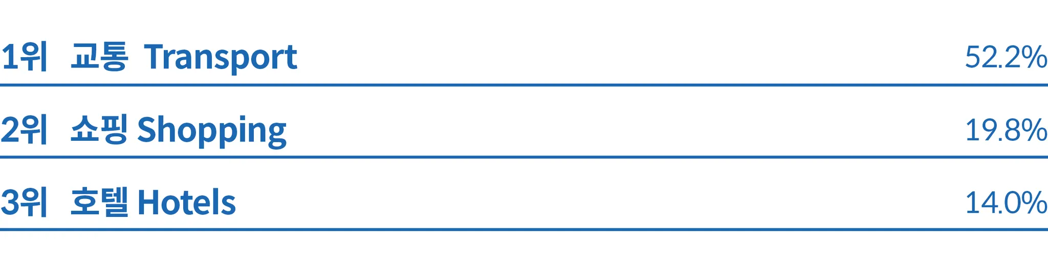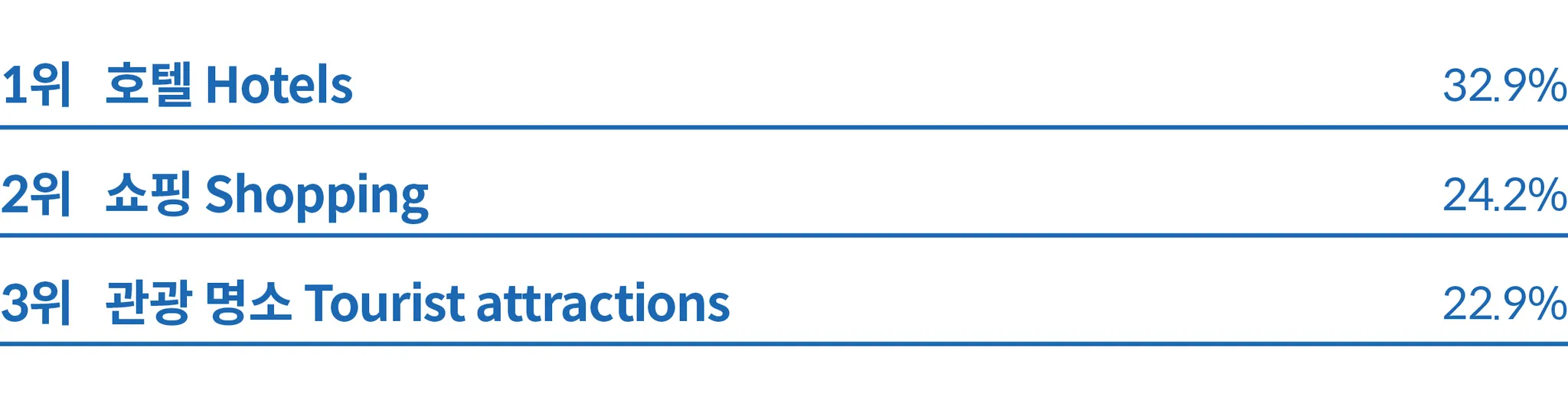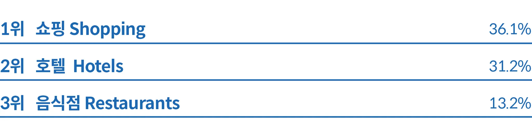 일본은 교통이 49.5%로 가장 높은 비중을 차지해 일본 내 여행 또는 여정의 일부로 교통 거점을 방문하고자 하는 수요가 높다는 것을 알 수 있다. 관광 명소도 20.2%로 높은 비중을 차지해 관광객들이 일본을 관광지 방문 목적으로 많이 찾는다는 것을 알 수 있다.