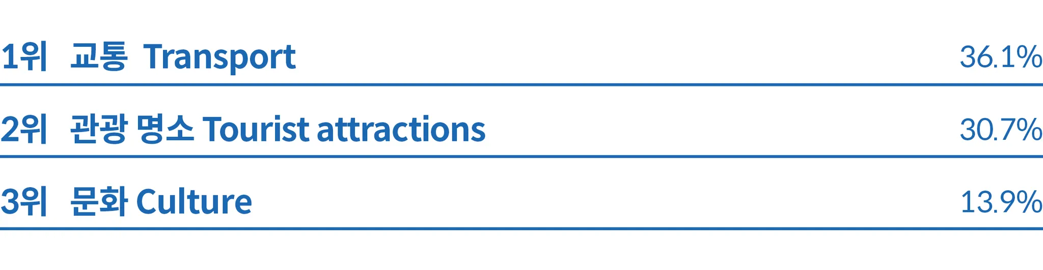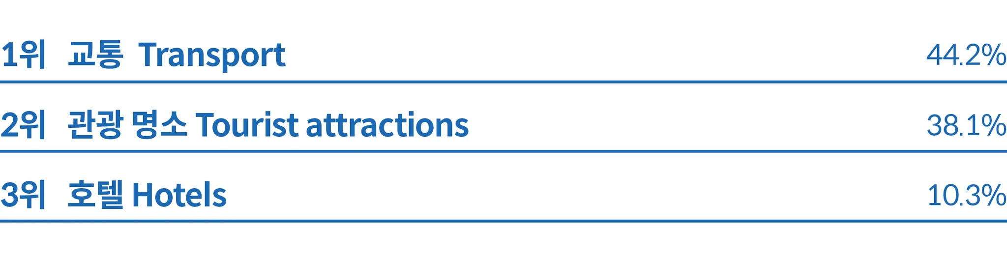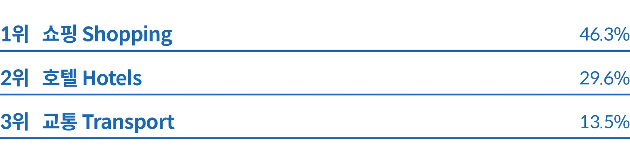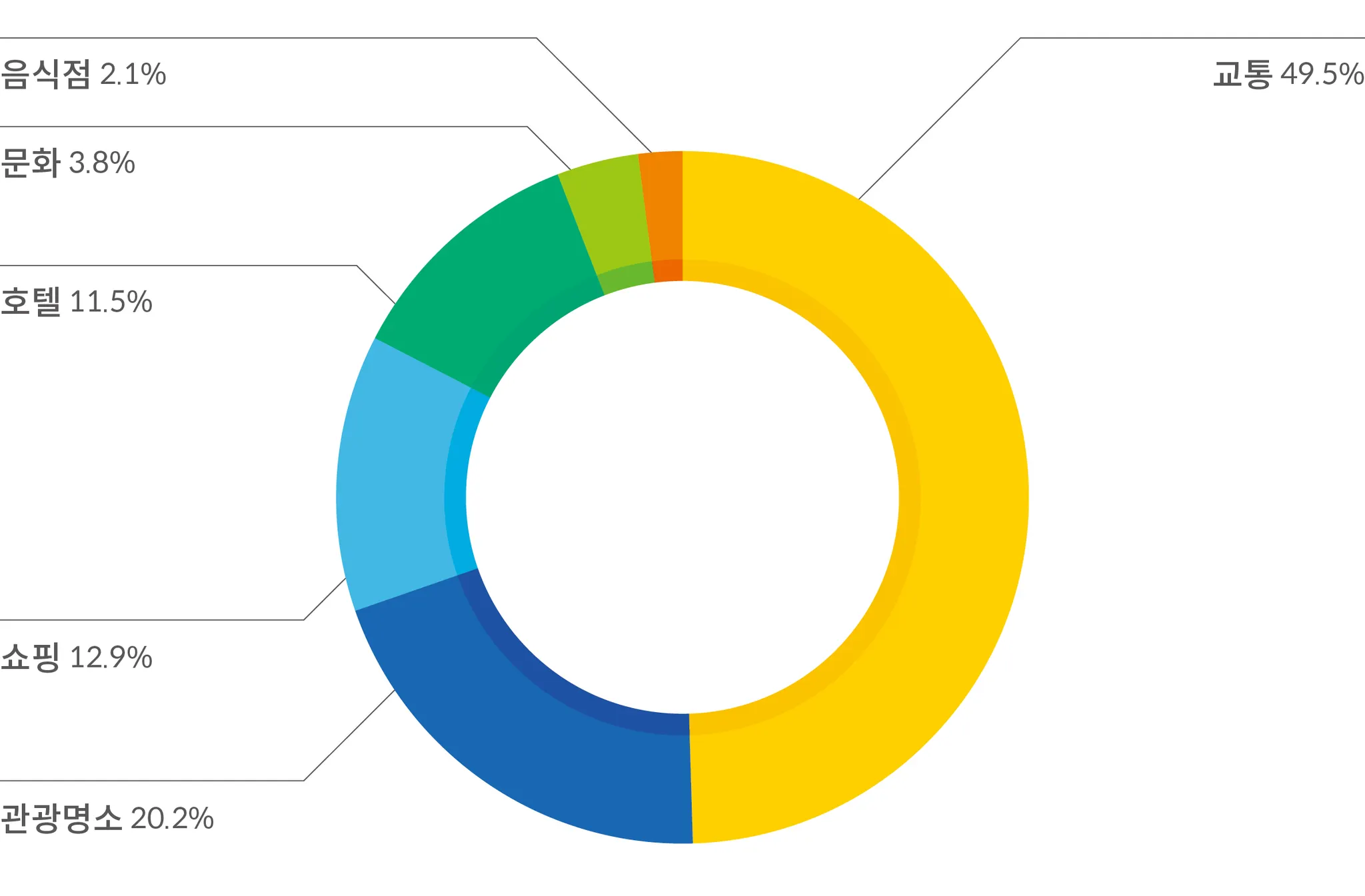 일본은 교통이 49.5%로 가장 높은 비중을 차지해 일본 내 여행 또는 여정의 일부로 교통 거점을 방문하고자 하는 수요가 높다는 것을 알 수 있다. 관광 명소도 20.2%로 높은 비중을 차지해 관광객들이 일본을 관광지 방문 목적으로 많이 찾는다는 것을 알 수 있다.