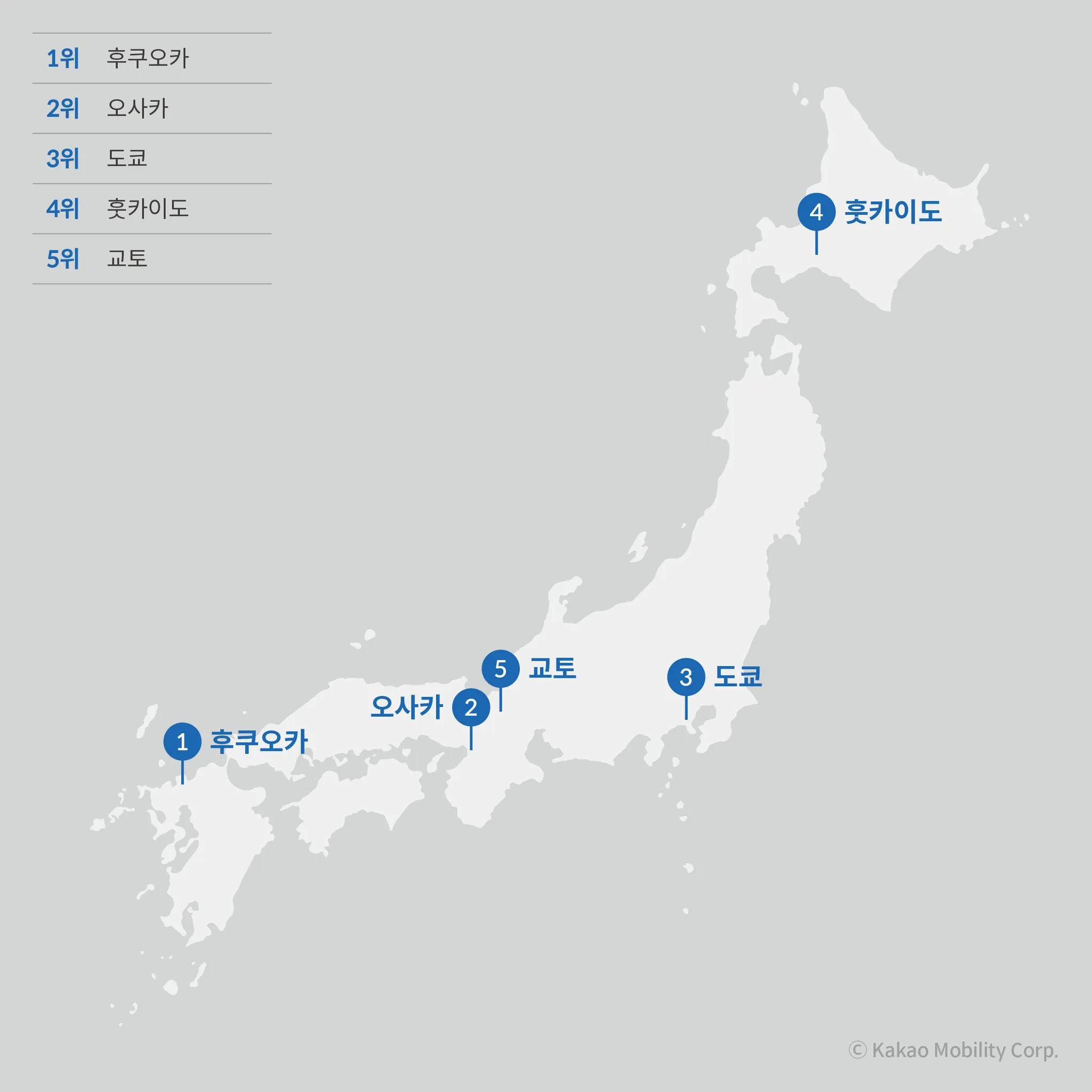 일본에서 카카오 T를 가장 많이 이용하는 도시는 후쿠오카로 나타났다. 이어서 2위는 오사카, 3위는 도쿄로 나타났다. 4위는 홋카이도, 5위는 교토였다. 오사카, 도쿄와 같은 대도시보다 후쿠오카의 순위가 높게 나타나고 있는 것이 특징적이다.
