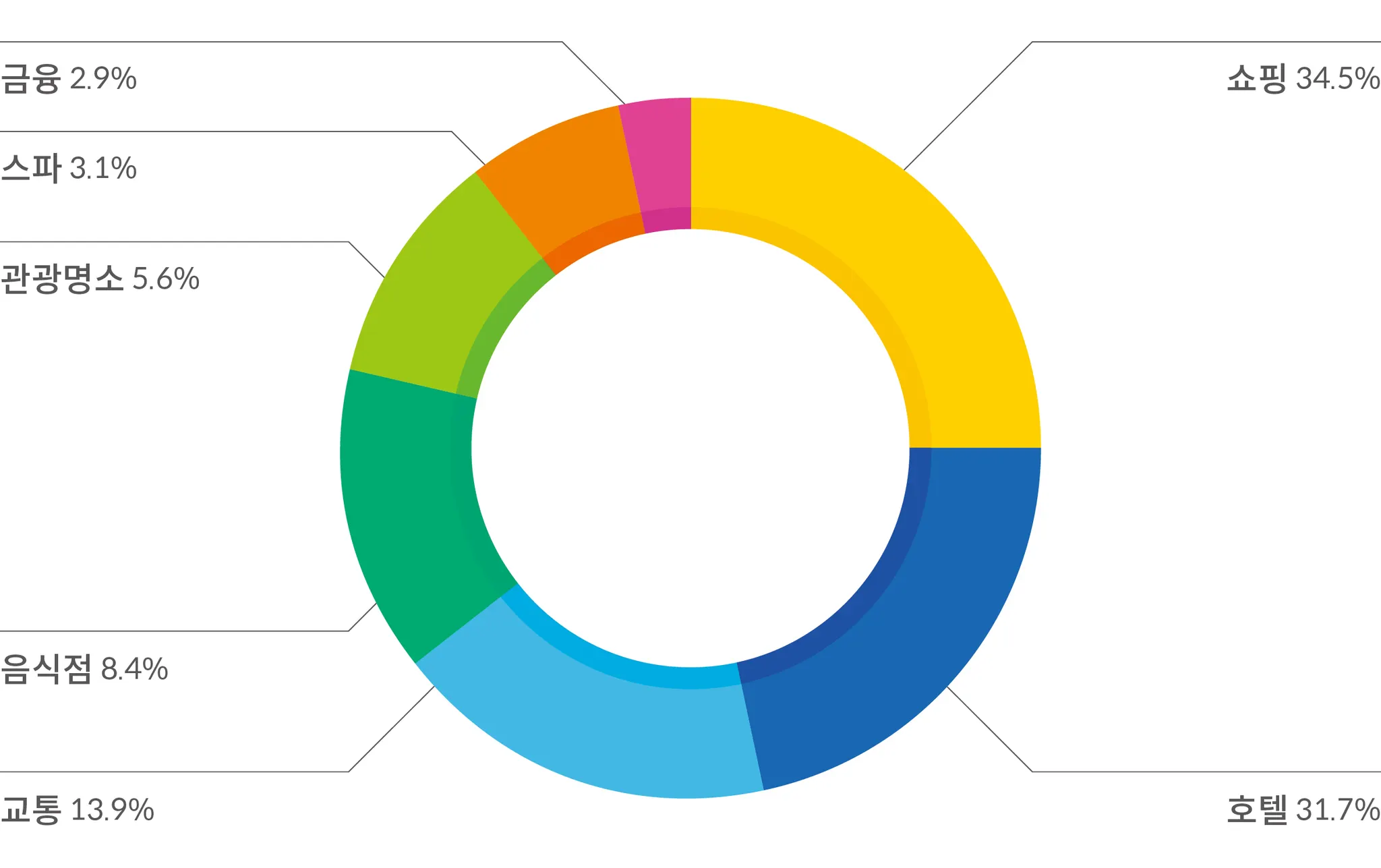 호텔, 리조트, 게스트하우스 등은 11.5%, 극장, 박물관, 전시회 등 문화 활동은 3.8%의 비중을 차지하는 것으로 나타난다. 마지막으로 음식점이 2.1%로 비교적 낮은 비율을 차지하고 있지만, 일본의 다양한 미식 체험을 즐기려는 여행객들이 일정 부분 존재한다고 볼 수 있다.