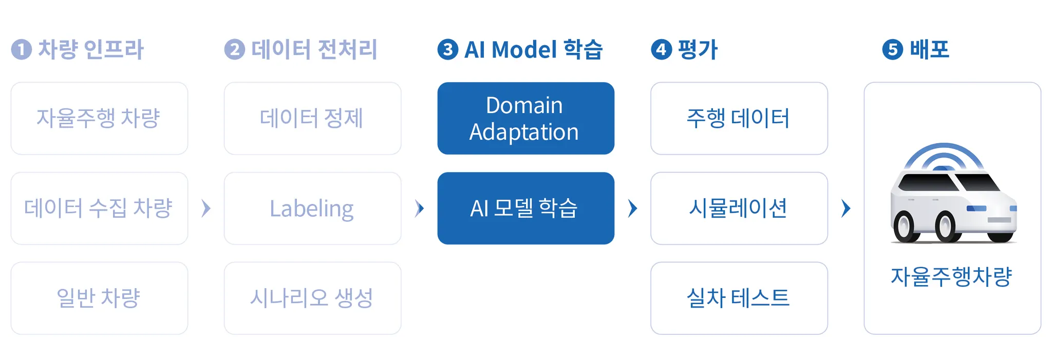 카카오모빌리티는 전처리된 데이터를 활용하여 차량에 최적화된 인식 및 주행 모델을 학습하고 있다. 이 과정에서 실제 자율주행 차량과 다른 센서 구성이나 현재 운행 중인 ODD(Operational Design Domain)와 다른 시간대, 지역에서 수집한 데이터들을 함께 활용한다. 이렇게 다양한 환경과 조건의 데이터를 효과적으로 활용하기 위해 도메인 어댑테이션 기술에 대한 연구도 진행 중이다.