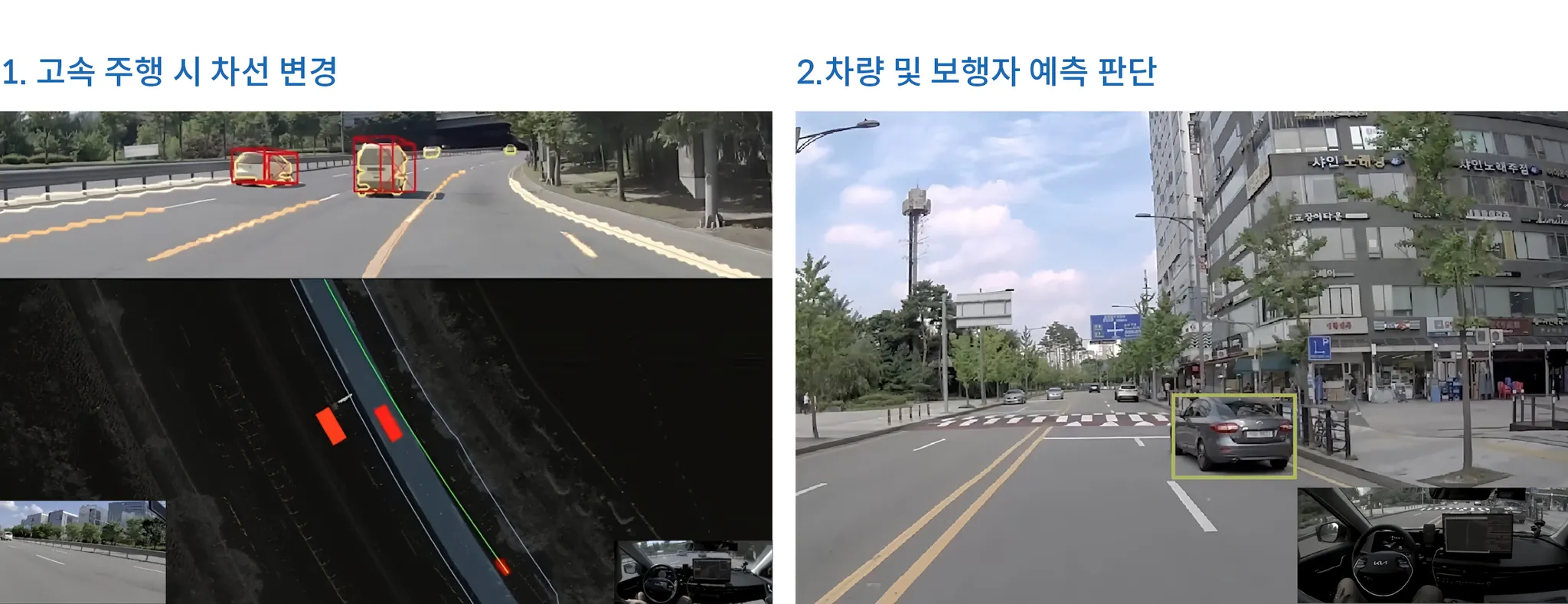 다양한 데이터를 활용한 학습 결과를 통해서 고도화된 인식 및 주행 모델을 구축하였다. 카메라, 라이다, 레이더 등 각 센서에서 얻은 정보를 활용한 모델들은 세그멘테이션, 바운딩 박스 추출, 프리스페이스 탐색, 객체 속도 추정 등의 작업을 수행한다.