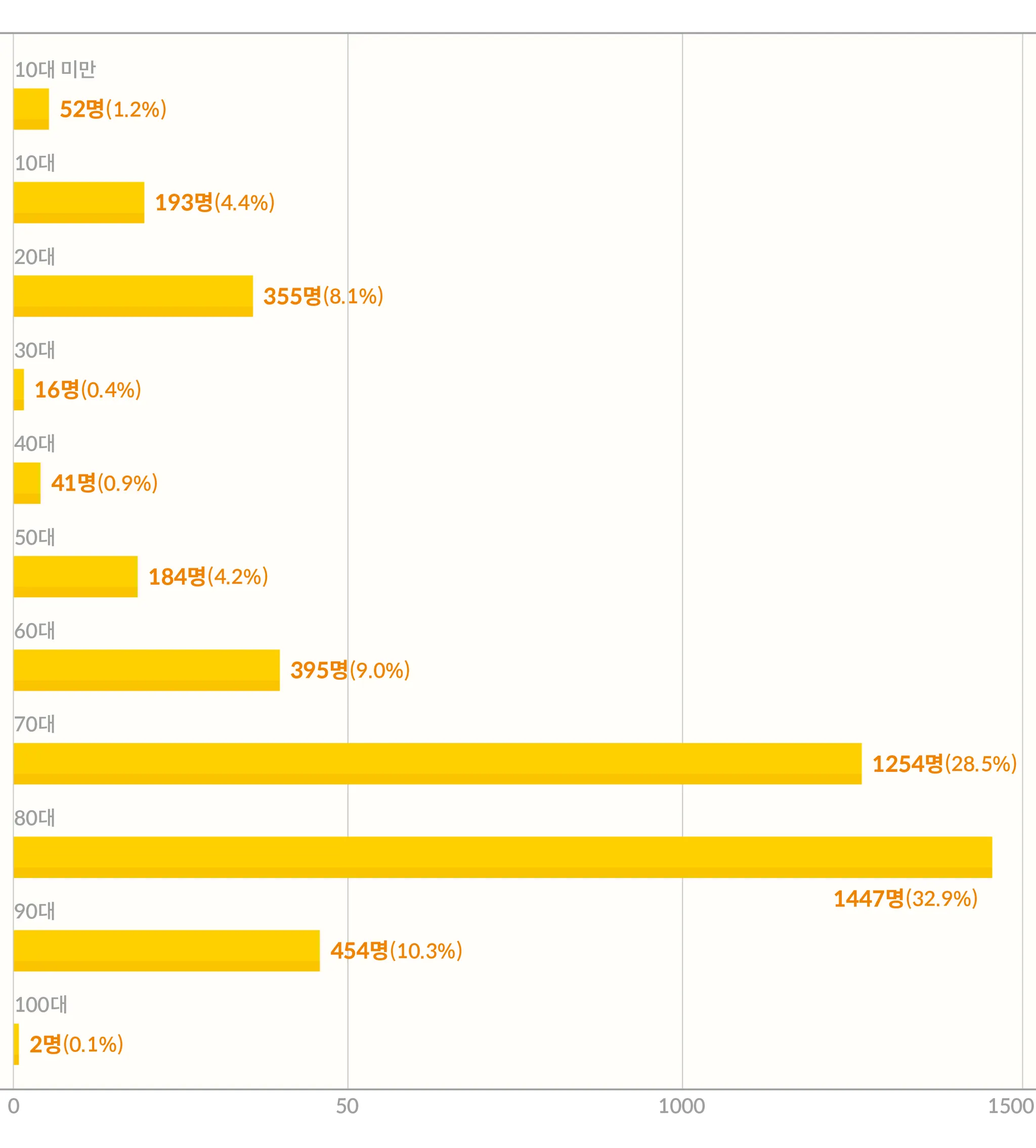 그래프를 보면, 우리 서비스가 고령자분들의 필수 생활 이동을 크게 지원하고 있음을 알 수 있어요. 80대 이상의 이용자가 무려 32.9%를 차지하며 가장 많은 부분을 이루고 있습니다. 이는 1,447명의 고령의 이용자분들께서 희망차를 통해 병원 방문, 가족과의 만남, 또는 다른 중요한 일상 활동을 위한 이동을 안전하고 편안하게 하고 계시다는 걸 보여줍니다. 70대 또한 28.6%, 즉 1,254명이 희망차를 이용하며 생활의 질을 높이고 계세요. 저희 서비스를 통해 병원이나 중요한 일상의 이동이 한결 더 수월해지셨기를 바랍니다.