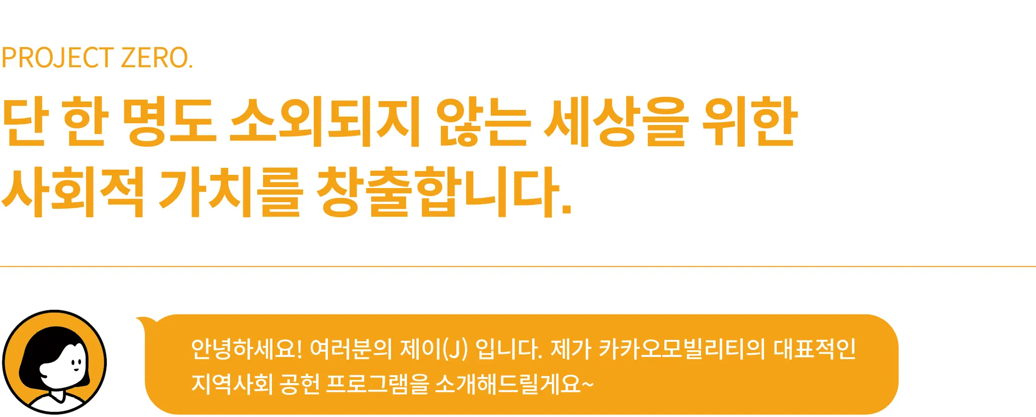 안녕하세요, 여러분! 저희는 카카오모빌리티 임팩트브랜드팀입니다. 저희는 카카오모빌리티가 최근에 선보인 소셜임팩트 브랜드, ‘201 캠페인'을 담당하고 있습니다. 앞서 파트너 상생 매니저 K가 소개한 ‘프로젝트 2’의 생생한 이야기들을 잘 보셨을 텐데요. 이어서 지역사회 상생 매니저 J와 친환경 매니저 Y가 등장합니다. 파트너와의 동행을 넘어 모두를 위한 포용과 지속가능성에 대한 고민을 담은 ‘프로젝트 0’과 ‘프로젝트 1’을 소개합니다.