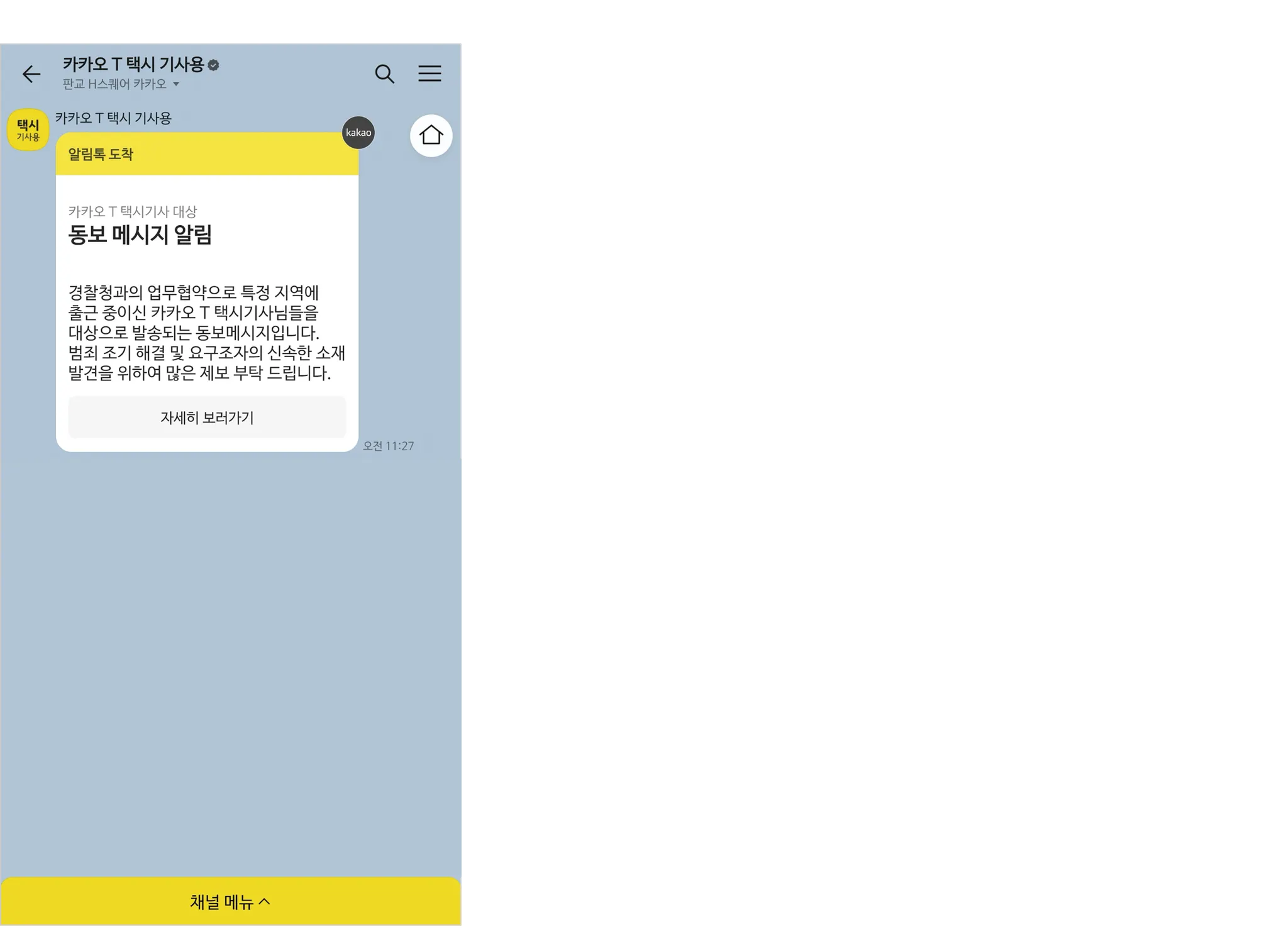 카카오 T 동보메시지 알림톡 화면 예시