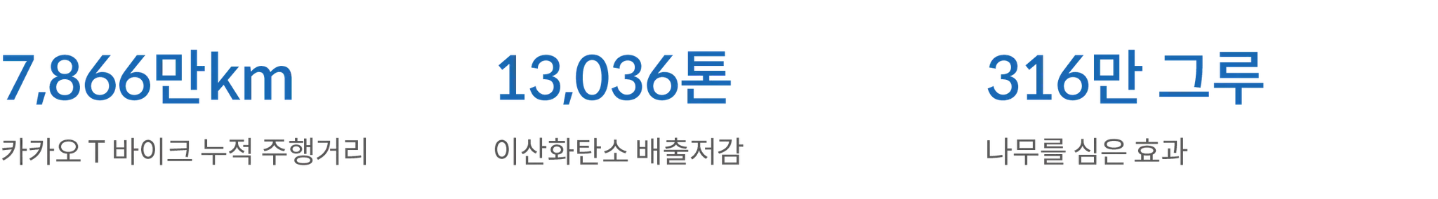 카카오 T 바이크는 2019년 2월 서비스 출시 이후 줄곧 환경에 의미 있는 영향을 주고 있습니다. 2023년 12월까지 누적 이용 거리 7,866만 km를 기록하며, 내연기관 자동차 이용 대비 약 13,036톤의 이산화탄소 배출을 감축하였습니다. 이는 약 316만 그루의 소나무가 흡수할 수 있는 탄소 양과 맞먹는 수치예요. 친환경 전기자전거의 보편화는 기후 변화 문제 해결에 큰 도움이 될 것입니다. 그리고 카카오 T 바이크는 기후 변화 대응에 기여할 수 있는 친환경 이동 수단이자 편리한 라스트마일 서비스로 계속해서 발전해 나갈 거예요.