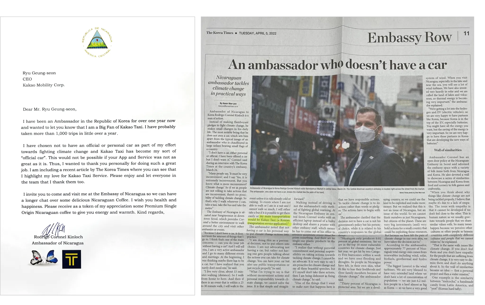 편지를 보내주신 주인공은 바로 사진 속 ‘로드리고 코로넬 주한 니카라과 대사님' 이셨는데요. 대사님이 2021년 대한민국에 부임하신 이후 줄곧 관용차량 대신 카카오 T 택시를 이용해 일정에 참석해 온 사연이 화제가 되어 언론에까지 보도되었다고 합니다.