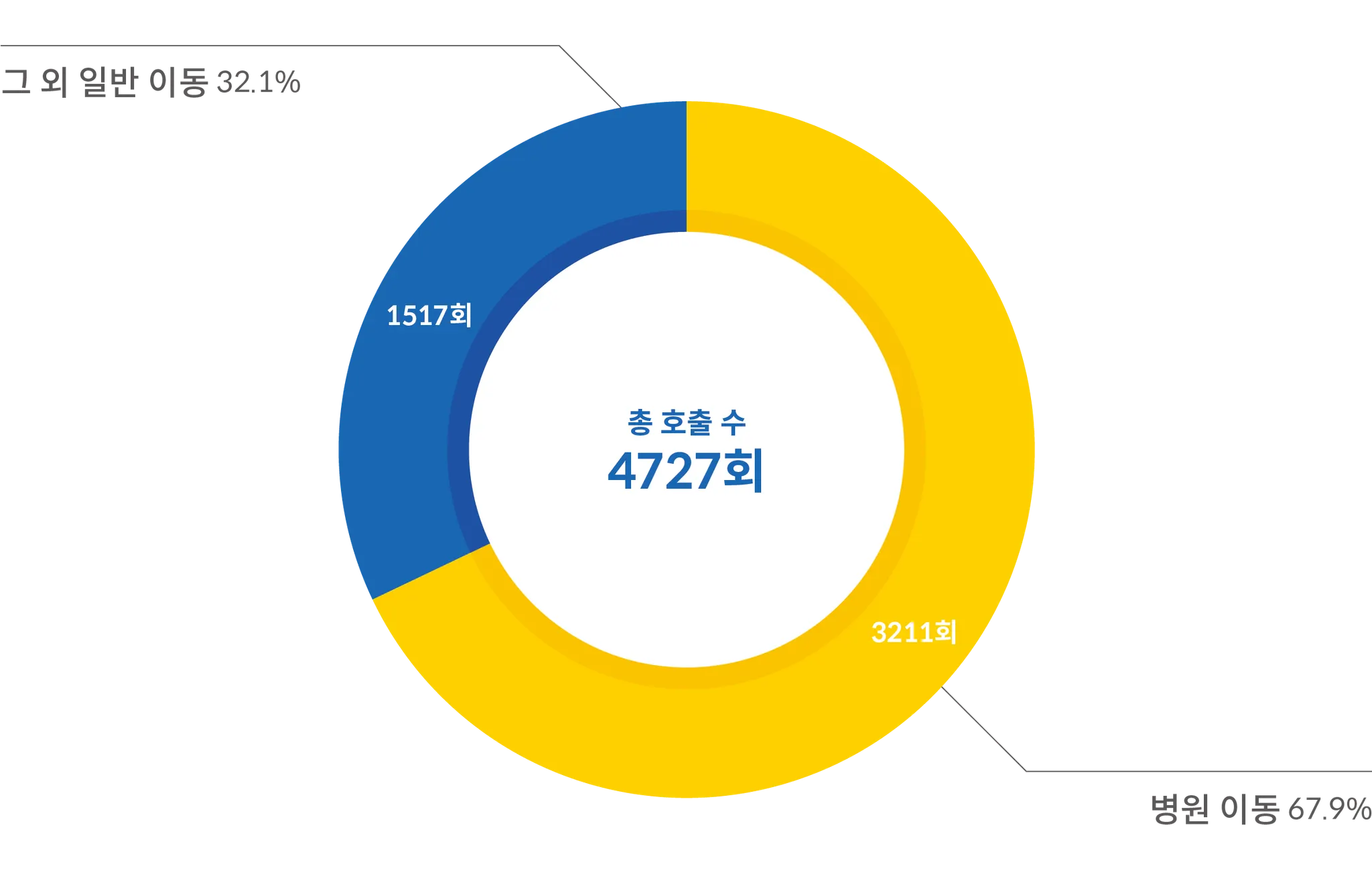 서대문 희망차는 어떤 목적으로 가장 많이 이용되고 있을까요? 데이터를 보니, 이동 약자 분들의 일상 속에서 ‘서대문 희망차’가 얼마나 소중한 역할을 했는지가 정말 눈에 띄네요. 우선, 총 호출 횟수가 무려 4727회에 달한다는 점, 정말 대단하지 않나요? 이 중에서 대다수인 3,211회, 즉 67.9%가 병원 이동을 위한 호출이었어요. 이는 ‘서대문 희망차’가 건강 관리에 절대적으로 중요한 역할을 했다는 걸 의미해요. 이동에 제약이 있으신 분들이 병원을 방문하시는 데 있어서, 우리 서비스가 얼마나 중요한지 새삼 느껴집니다.
