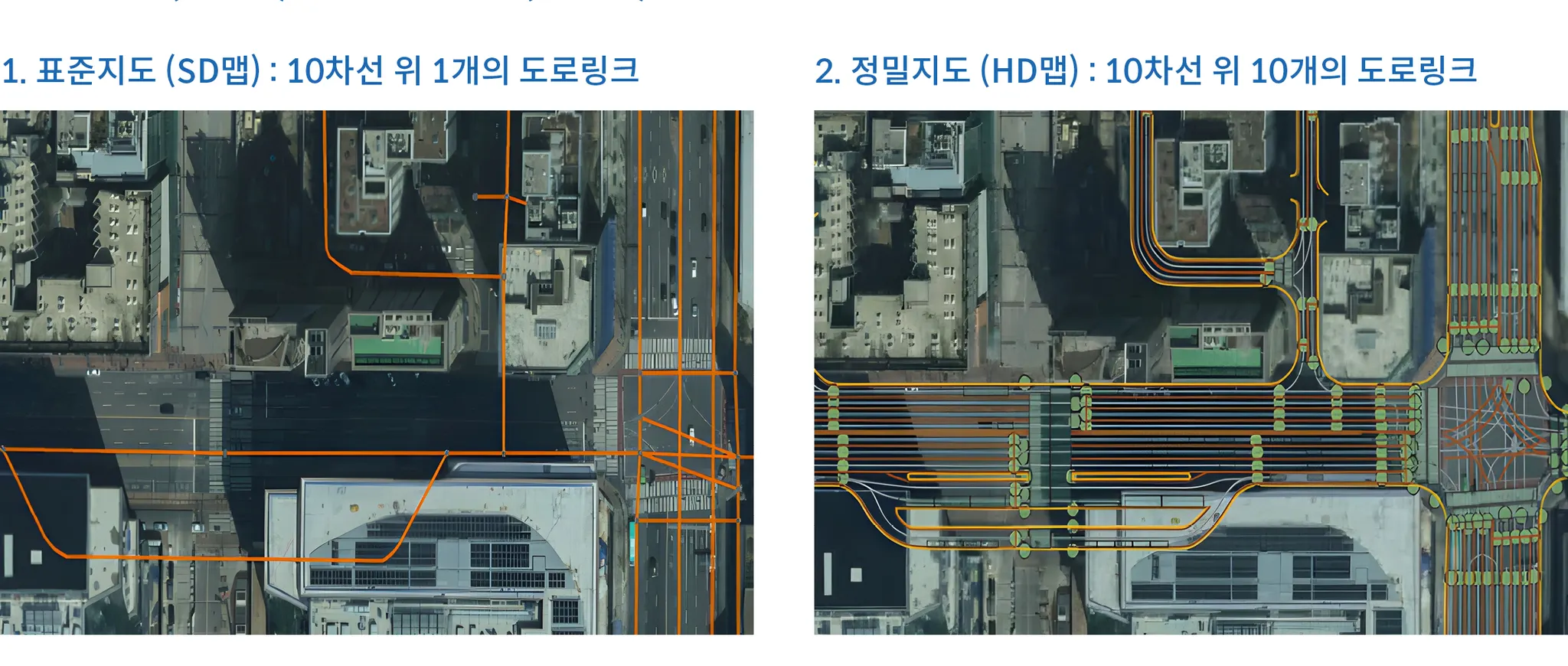 표준지도(SD맵)와 정밀지도(HD맵)의 도로링크 차이