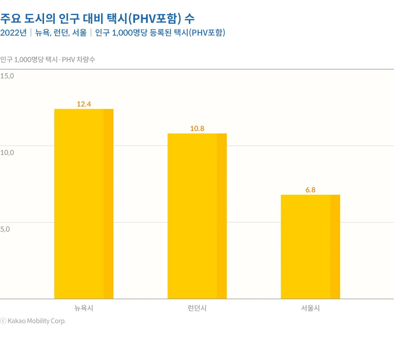 2022년 기준으로 인구 1000명당 택시(PHV포함) 수는 뉴욕이 12.4대, 런던이 10.8대인데, 서울은 6.8대에 불과하다. 일반적으로 해외에 비해서 우리나라의 인구 대비 택시 수가 많다고 생각하지만, 모빌리티 플랫폼이 도입된 이후 우리나라의 택시 공급 규모는 상대적으로 적은 수준이다. 거리두기 해제 이후 우리나라 택시 시장에 나타난 승차난 문제의 주요 원인이 경직적이고 위축된 택시 공급으로 나타나고 있는 만큼 공급 측면에 대한 고민이 필요한 대목이다.