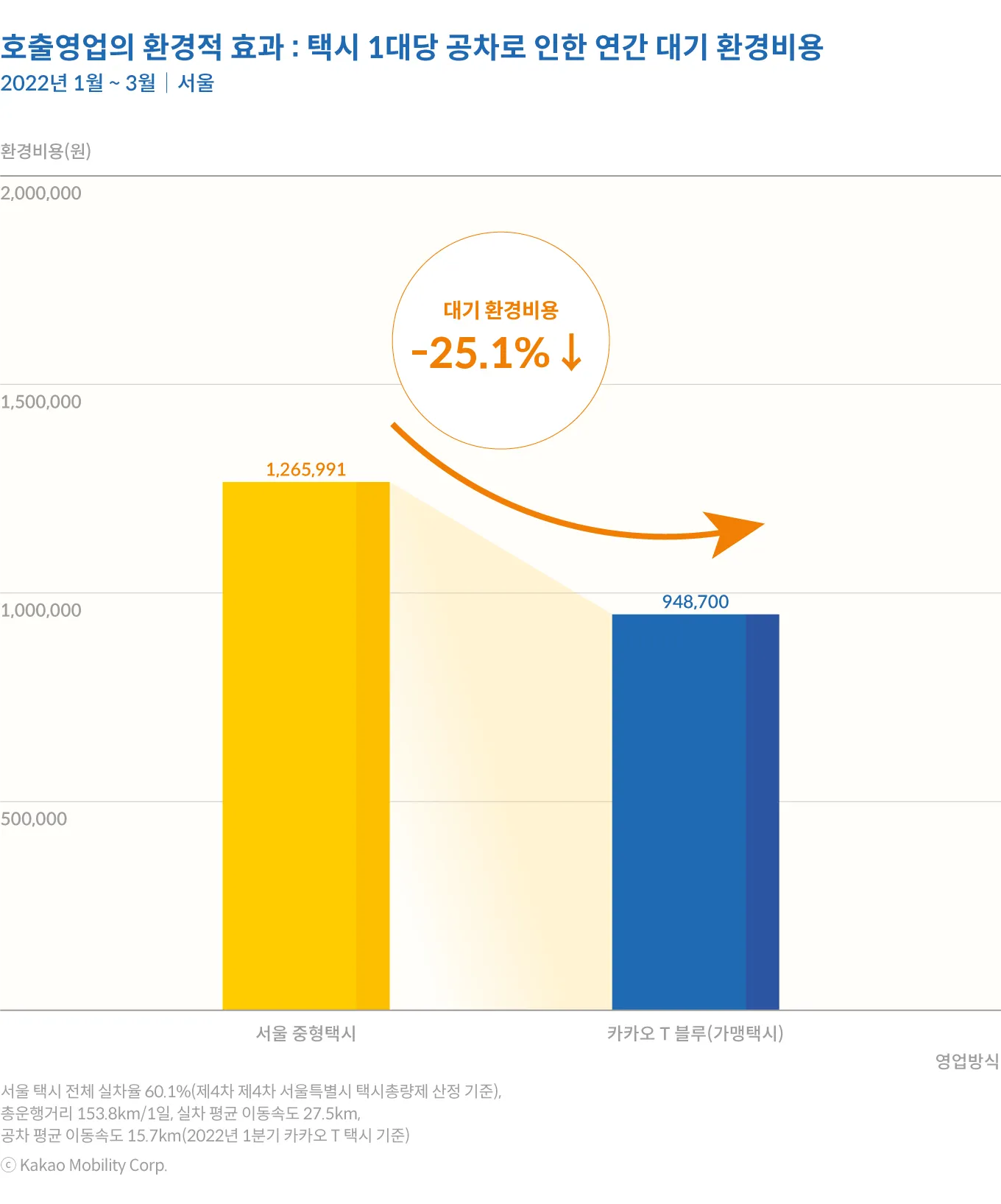 플랫폼을 통한 영업 효율 개선은 기사나 택시 사업자의 편익에만 그치지 않고 환경적 측면에서도 편익을 제공하는 것으로 나타난다. 카카오모빌리티는 아주대학교 지속가능도시교통연구센터의 이규진 교수와의 협동 연구를 통해서 카카오 T 블루와 평균적인 서울 택시의 실차율과 실차와 공차시 평균 이동 속도를 고려하여 연간 대기 환경비용을 환산해 보았다. 분석 결과 플랫폼을 통한 영업 효율 개선은 택시가 승객 없이 운행하게 되는 공차 거리를 줄이게 되어 대기환경 비용을 절감하는 것으로 나타났다. 공차로 인한 대기환경 비용은 카카오 T 블루가 일반적인 서울 택시에 비해서 연간 1대 평균 25.1%나 낮은 것으로 나타났다.
