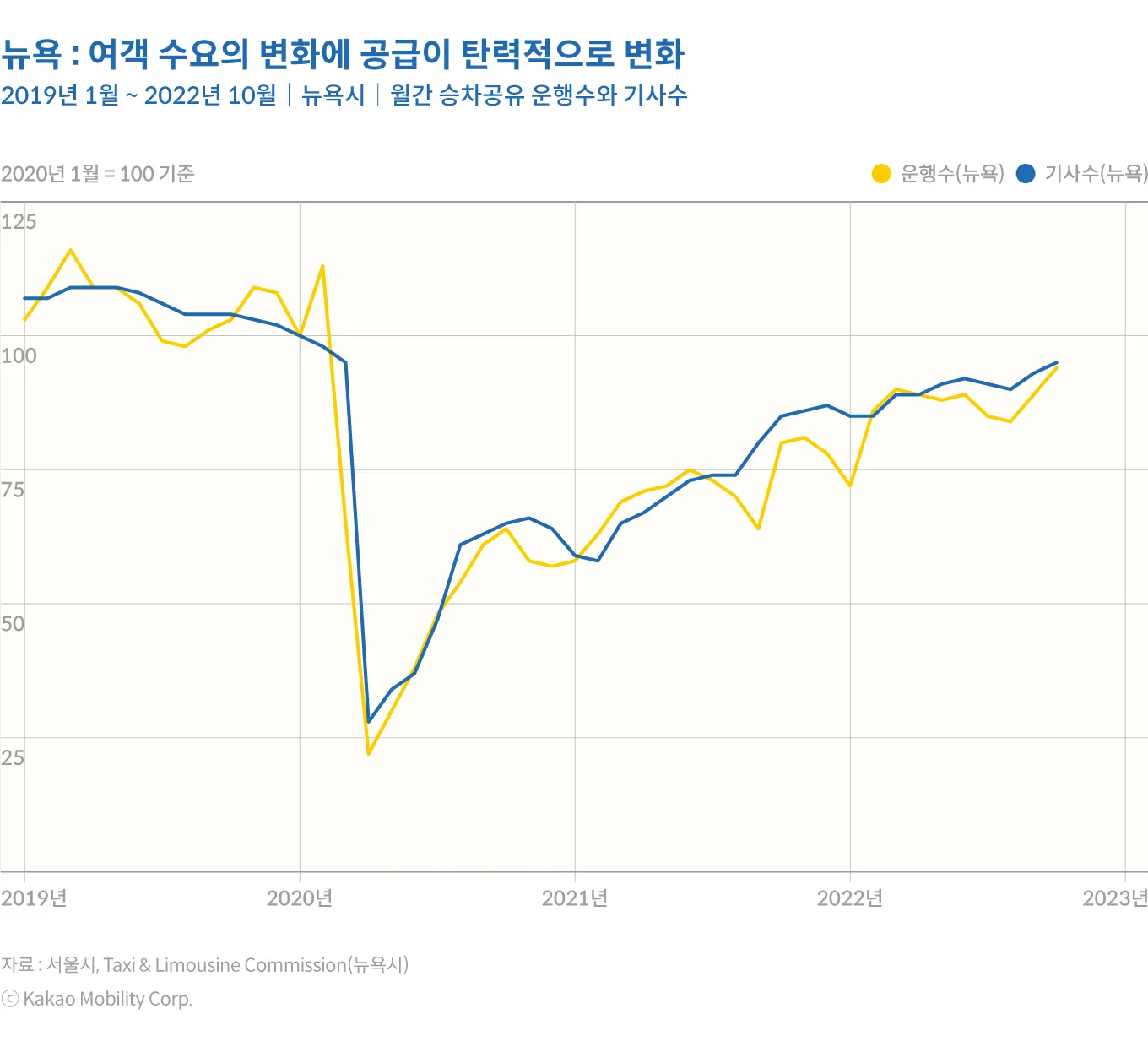미국 뉴욕시에서도 택시 승차난이 이슈가 되었지만, 공급의 탄력성은 상대적으로 높은 편이다. 뉴욕시의 택시 시장을 주도하고 있는 플랫폼 기반 여객운송서비스(TNC) 공급은 수요에 매우 민감하게 반응한다. 팬데믹으로 ‘셧다운’이 시행된 시기에는 공급과 수요 모두 4분의 1 수준까지 급락하였지만, 이후 수요와 공급 모두 지속적인 회복세를 보이고 있다. 상대적으로 기사들의 진출입이 자유롭고, 탄력요금제 등 수급 상황에 맞게 가격 기제가 작동하는 만큼 수요에 따라서 공급이 탄력적으로 반응하는 모습이 뚜렷한 것으로 보인다.