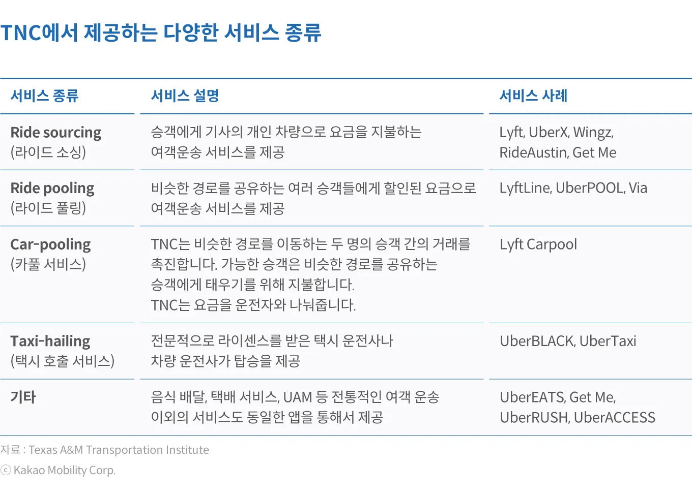 모빌리티 플랫폼 기업들은 동일한 앱을 통해서 여러 서비스를 쉽게 제공할 수 있다. 미국의 TNC의 경우 사용 가능한 서비스는 지역의 시장 상황과, 규제 등에 따라 상이하지만, 하나의 앱을 통해서 이용할 수 있는 서비스의 종류가 다양하다. 승차공유로 알려진 라이드 소싱(ride sourcing)부터 라이드 풀링, 카풀, 택시 호출, 음식 배달 등을 제공하고 있는 것으로 나타난다.