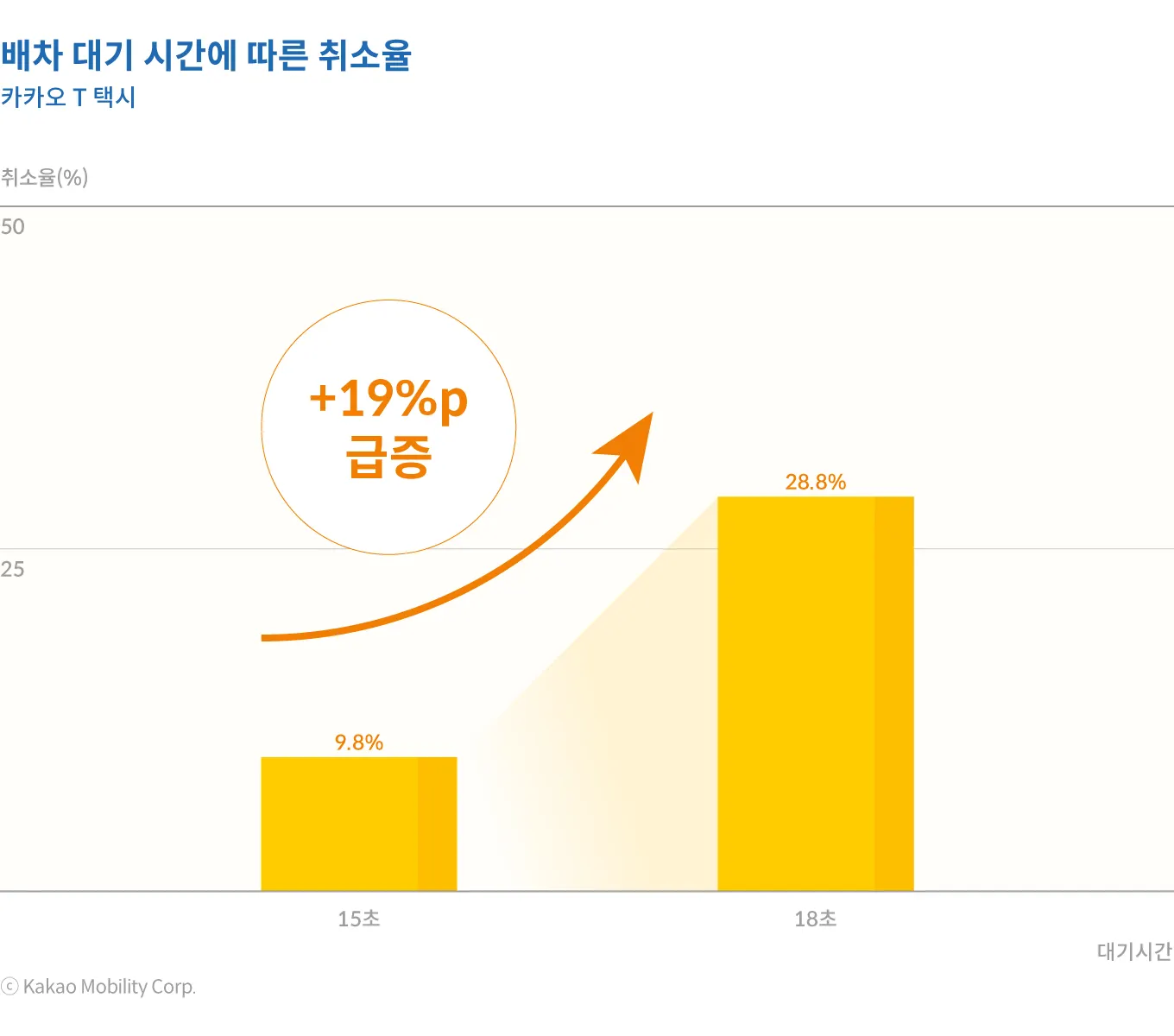 대기 시간은 소비자 측면에서 서비스 품질을 판단하는 가장 중요한 지표 중 하나이다. 배차 대기 시간에 따른 호출 취소율을 보면 승객이 택시를 호출하고 대기 시간이 15초를 경과한 이후부터 취소율은 급격하게 상승하기 시작한다. 특히, 배차 대기 시간 15초일 경우 9.8%였던 취소율은 불과 3초 후인 18초에는 28.8%로 급증하는 것으로 나타난다. 대기 시간이 줄어들지 못하면, 소비자들은 대체 수단을 찾아서 플랫폼을 떠나고, 이는 궁극적으로 공급자의 영업 축소로 연결될 수 있다.