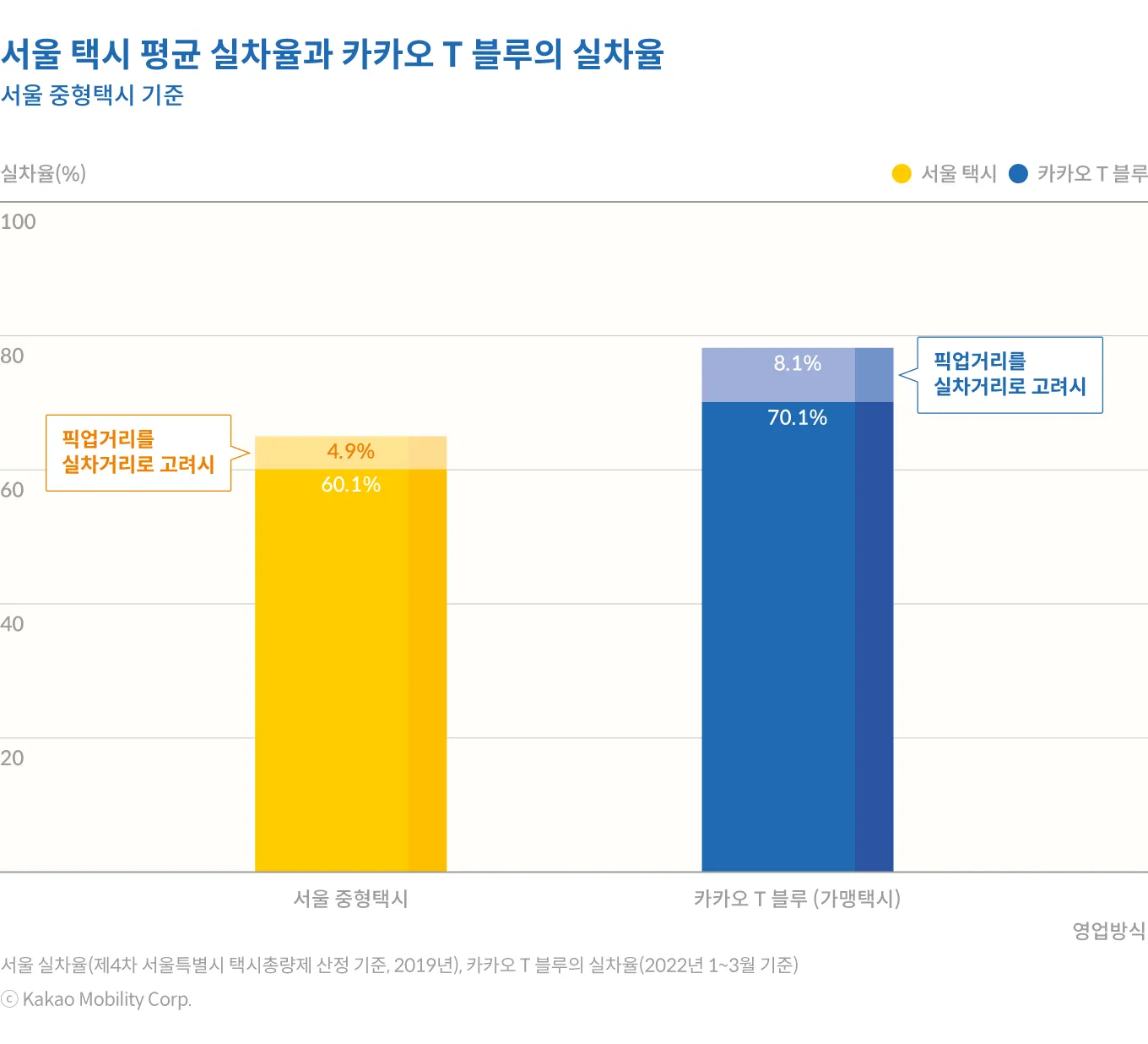 카카오 T 블루의 실차율은 2022년 1분기 기준 70.1%로 나타난다. 서울 중형택시 전체의 실차율 60.1%에 비해서 약 10%p가 높은 수치다. 픽업거리를 실차율 산정에 반영할 경우 실차율은 8.1%p가 더해져 최대 78.2%로 높아진다. 서울 중형택시의 실차율에 픽업거리를 반영한 65.0%보다는 13.2%p가 높은 수치이다. 카카오 T 블루와 같이 플랫폼을 통해서 호출영업을 많이 할수록 승객 없이 빈차로 운행할 확률이 크게 낮아진다는 것이 수치로 잘 나타난다.