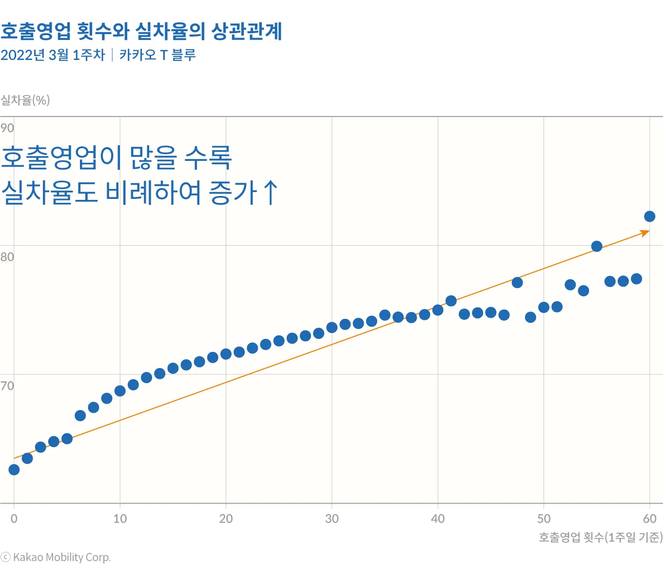 우리나라에서도 모빌리티 플랫폼으로 인한 영업 효율 개선이 큰 것으로 나타난다. 카카오 T 블루는 중형택시 시장에 도입된 플랫폼 가맹택시이다. 카카오 T 블루는 블루미터라고 불리는 별도의 장치를 통해 앱을 통한 호출영업 데이터뿐만 아니라 배회영업에 대한 데이터도 축적해 왔다. 이를 통해서 그동안 제한적으로 파악되어 왔던 중형택시의 배회영업 행태에 대해서도 새로운 인사이트를 얻을 수 있다. 이렇게 축적된 데이터로 카카오 T 블루(서울 택시 기준)의 거리 실차율(총 운행거리 중 승객을 승차시킨 상태에서 운행한 거리의 비율)을 분석해 본 결과 호출영업 횟수가 많을수록 거리 실차율도 비례하여 높아지는 경향이 뚜렷하게 나타났다.