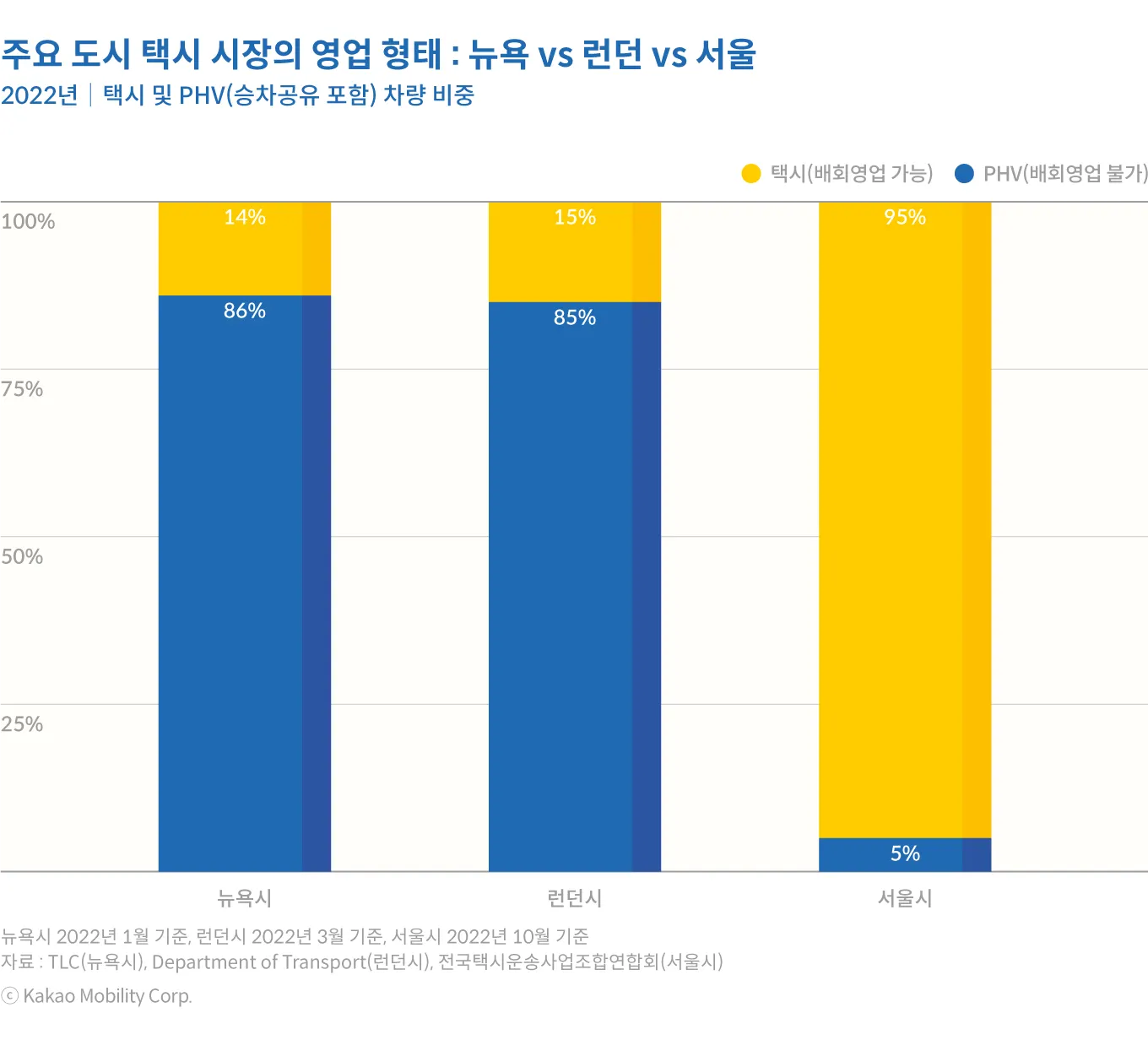 뉴욕과 런던의 경우 배회영업이 가능한 옐로캡(뉴욕), 블랙캡(런던) 등 전통적 형태의 택시가 전체 택시 시장 차량의 각각 14%, 15%에 불과하다. 나머지 차량의 대다수는 승차공유 플랫폼과 연계된 PHV가 차지하고 있으며, 배회영업이 불가능하다. 반면, 서울 택시의 95%는 배회영업이 가능한 전통적 택시(중형택시, 모범택시 등)가 차지하고 있다. 국내는 PHV가 별도로 존재하지는 않지만, 호출영업 위주의 택시(고급택시, 대형승합택시 등)는 서울의 경우 5%로 집계된다. 다수의 국내 택시 기사들은 하루 중에도 배회영업과 플랫폼을 통한 호출영업을 언제든 쉽게 전환하면서 병행하고 있다. 승객들도 길거리에서 잡을 수 있는 택시를 앱을 이용해서도 언제든 부를 수 있다. 배회영업과 호출영업 시장이 수요와 공급 측면에서 모두 사실상 구분이 없다. 택시 시장의 압도적 다수를 차지하는 중형택시 등 전통적 택시와 모빌리티 플랫폼이 연결되어 ‘플랫폼 택시’가 만들어진 결과다.