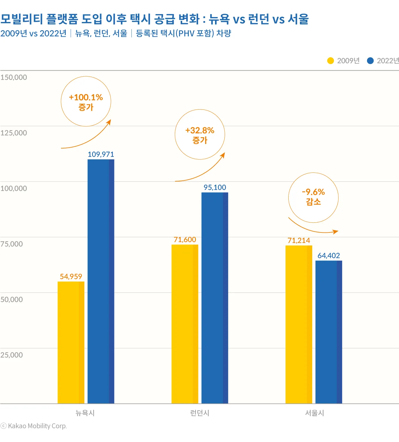 모빌리티 플랫폼이 도입되기 직전인 2009년만 하더라도 뉴욕(5.5만 대)은 서울(7.1만 대)에 비해서 택시(PHV포함) 공급 규모가 작았고, 런던(7.2만 대)은 서울과 거의 같은 규모였다. 그러나 모빌리티 플랫폼이 본격적으로 도입된 이후 시장 상황이 많이 바뀌었다. 2022년 기준 뉴욕에는 10.9만 대의 택시가 등록되어 있는데, 2009년에 비해서 2배가 증가한 것이다. 런던도 같은 기간 32.8%가 증가하면서 택시수가 10만 대에 육박하고 있다. 뉴욕과 런던 모두 전통적인 배회영업 택시(옐로캡, 블랙캡 등) 차량은 감소하거나 소폭 증가한데 반해서, 플랫폼과 연계된 PHV 차량이 급속도로 늘어난 결과다. 반면, 서울은 같은 기간 택시수가 9.6%가 감소하면서 주요 도시에 비해서 공급이 상반된 움직임을 보이고 있다.