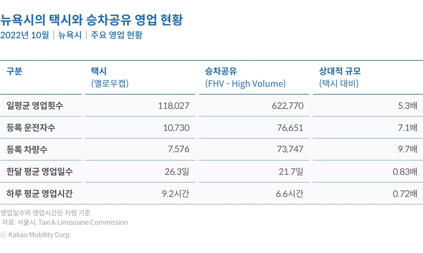 미국이나 영국은 승차공유 플랫폼이 빠르게 성장하여 PHV 차량의 수가 계속 늘어나면서 택시 시장이 PHV 중심으로 완전히 변모하였다. 하루 영업 횟수도 승차공유가 전통적인 택시를 압도하고 있는데, 뉴욕의 경우 2022년 10월 기준 승차공유의 일평균 영업 횟수가 62.3만 건에 달하는데, 전통적인 택시인 옐로캡은 11.8만 건에 불과하여 승차공유가 5배 이상 많이 이용되고 있다. 뉴욕의 운전자수나 차량수도 승차공유가 택시의 각각 7.1배, 9.7배로 승차공유가 택시를 압도하는 규모로 성장하였다. 한편, 한 달 평균 영업일수는 택시와 승차공유가 각각 26.3일, 21.7일로 택시가 약 5일 이상 더 영업을 하는 것으로 나타나고, 하루 평균 영업시간은 승차공유가 6.6시간으로 9.2시간인 택시보다는 짧은 것으로 나타난다.