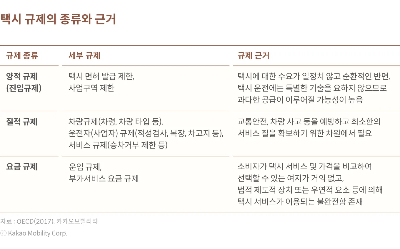 모빌리티 플랫폼은 택시 시장에 선제적으로 자리 잡으면서 택시 시장의 작동 메커니즘을 크게 바꾸었다. 과거에는 택시 시장에 내재한 시장 실패 요인을 보완하기 위해서 요금 규제, 운전자 규제, 차량 규제, 사업자 규제 등 다양한 규제가 불가피하였다. 그러나 모빌리티 플랫폼이 도입된 현재의 택시 시장은 모바일, 플랫폼, 데이터, AI 등 다양한 기술적 혁신에 힘입어 규제가 아닌 방식으로 시장의 문제를 해결할 수 있음을 보여주고 있다.