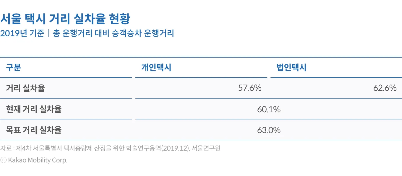 서울시 전체 택시의 거리 실차율은 가장 최근에 공개된 수치 기준(2019년)으로 60.1%로 나타난다. 개인택시 57.6%, 법인택시 62.6%를 단순 평균하여 산출된 수치다. 국토교통부의 「택시 사업구역별 총량제 지침」에서 제시한 목표 거리 실차율 63%에는 미치지 못하는 수치이다. 플랫폼을 통한 호출영업의 경우 배차 이후 승객을 픽업하기 위해서 이동하는 거리는 기존 배회영업 중심의 실차율 산정 방식에서는 공차로 산정되고 있는데, 「제4차 서울특별시 택시총량제 산정을 위한 학술연구용역」에서 호출영업의 픽업 거리를 실차율로 환산하면 거리 실차율은 최대 64.95%로 나타난다.
