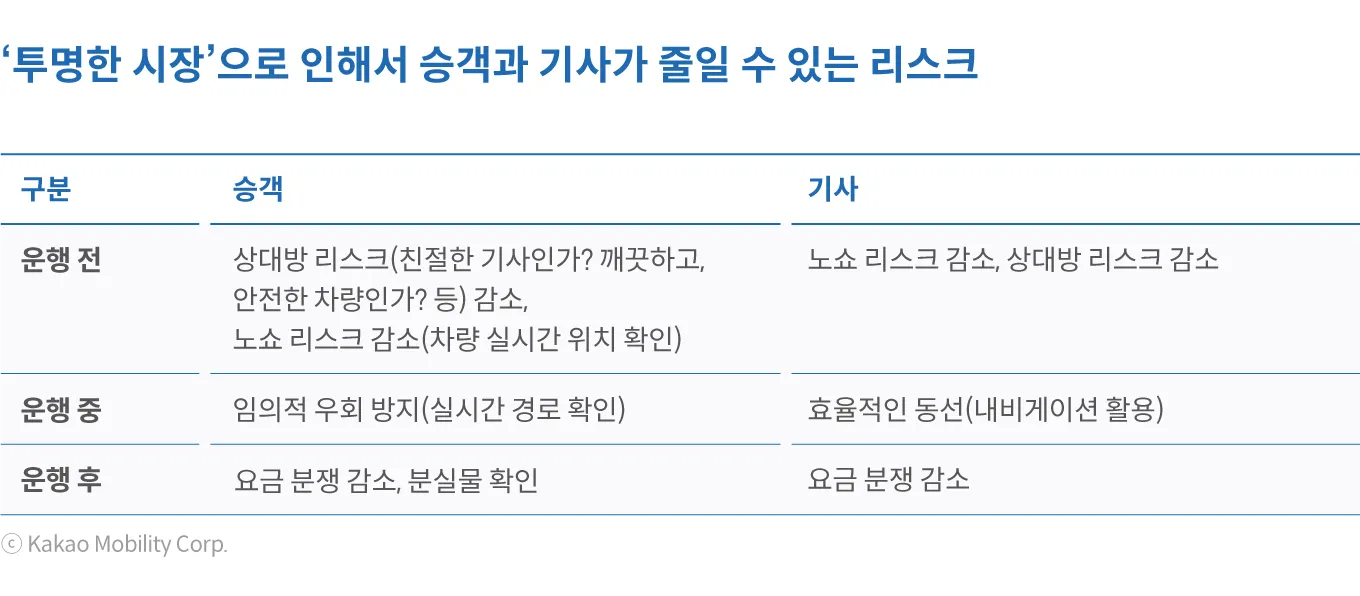 우선 승객은 불특정 다수의 기사 중 한 명과 매칭되는 상황에서 부담해야 하는 리스크를 크게 줄일 수 있다. 차량 탑승 전에 기사의 프로필과 평점을 확인하여 기사의 서비스와 차량 등에 대한 품질을 미리 가늠해 볼 수 있다. 차량을 탑승한 이후에도 실시간으로 경로를 확인할 수 있어서 우회로 인한 부당 요금에 대한 리스크도 낮출 수 있다. 운행 후에는 운행에 대한 기록을 바탕으로 요금 분쟁을 줄임과 동시에 필요한 경우 서비스에 대한 불만을 빠르게 접수하여 피드백을 받을 수도 있다. 카카오 T 택시는 택시 호출 시 택시 종류를 선택할 수 있을 뿐만 아니라 이용자가 사전에 소요시간과 예상요금에 따른 경로 선택이 가능하다. 과거에는 승객 개인의 지리적 숙지여부나 택시 기사에게 전적으로 의존해야 했던 부분을 승객이 사전에 인지하고 선택할 수 있게 됨에 따라 목적지까지 편안하게 이동할 수 있게 되었다.