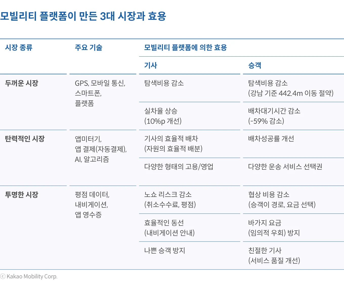 모빌리티 플랫폼이 바꾼 택시 시장의 성격은 크게 3가지로 정리할 수 있다. ‘두꺼운 시장’, ‘탄력적인 시장’, ‘투명한 시장’이 그것이다. 이러한 변화에는 스마트폰의 보급, 모바일 통신의 대중화 등에 따른 커뮤니케이션이 비용의 하락이 크게 영향을 미쳤고, 여기에 기반하여 플랫폼에 다수의 승객과 기사가 참여하고, 상호작용하면서 축적된 데이터가 서비스 개선에 활용되는 선순환도 크게 작용했다. 이러한 기반 하에 고도화된 인공지능 알고리즘을 활용하여 배차 시스템도 보다 효율적으로 활용할 수 있게 되었다.