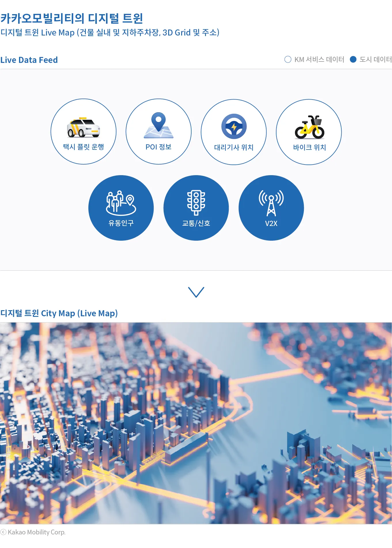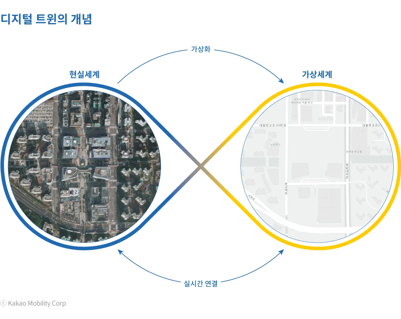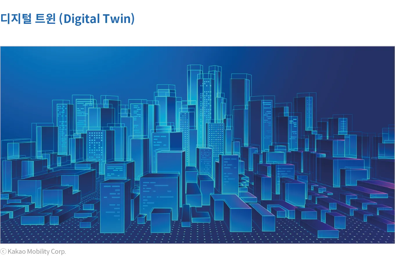 카카오모빌리티는 모빌리티 분야에서 이동의 주체가 인간에서 기계(AI)로 전환되는 상황을 대비하여, 기계(AI)가 안전하고 안정적으로 운영될 수 있도록 모빌리티 인프라를 갖추고자 한다. 택시, 대리, 바이크, 배송, 내비 등 카카오모빌리티의 서비스를 운영하면서 얻을 수 있는 라이브 데이터들과 도시 전반의 데이터들을 종합하여 디지털 트윈 도시 지도를 만들고 업데이트하여 “살아있는 모빌리티 인프라”를 구축하는 것이 바로 카카오모빌리티가 만들어 갈 디지털 트윈이다.