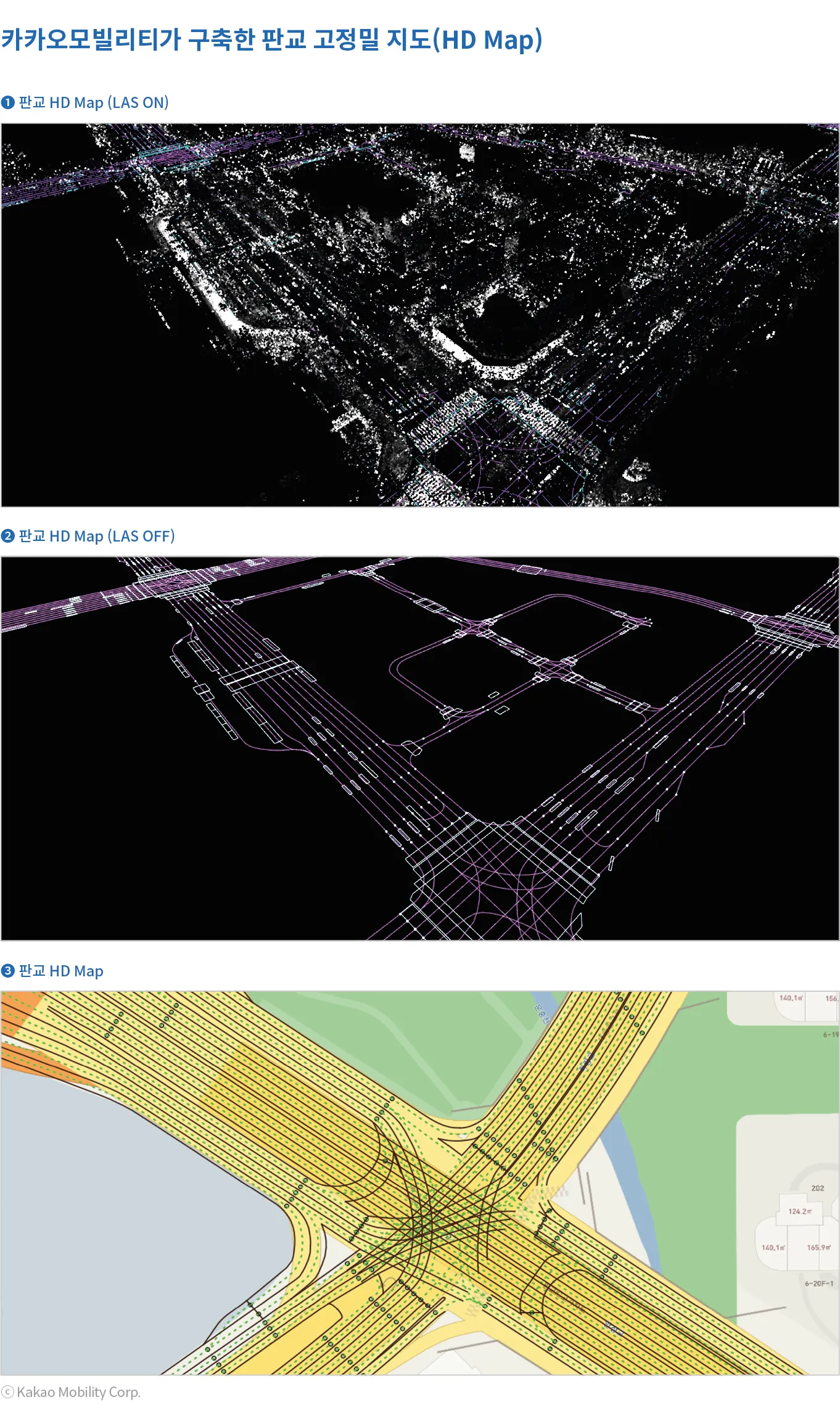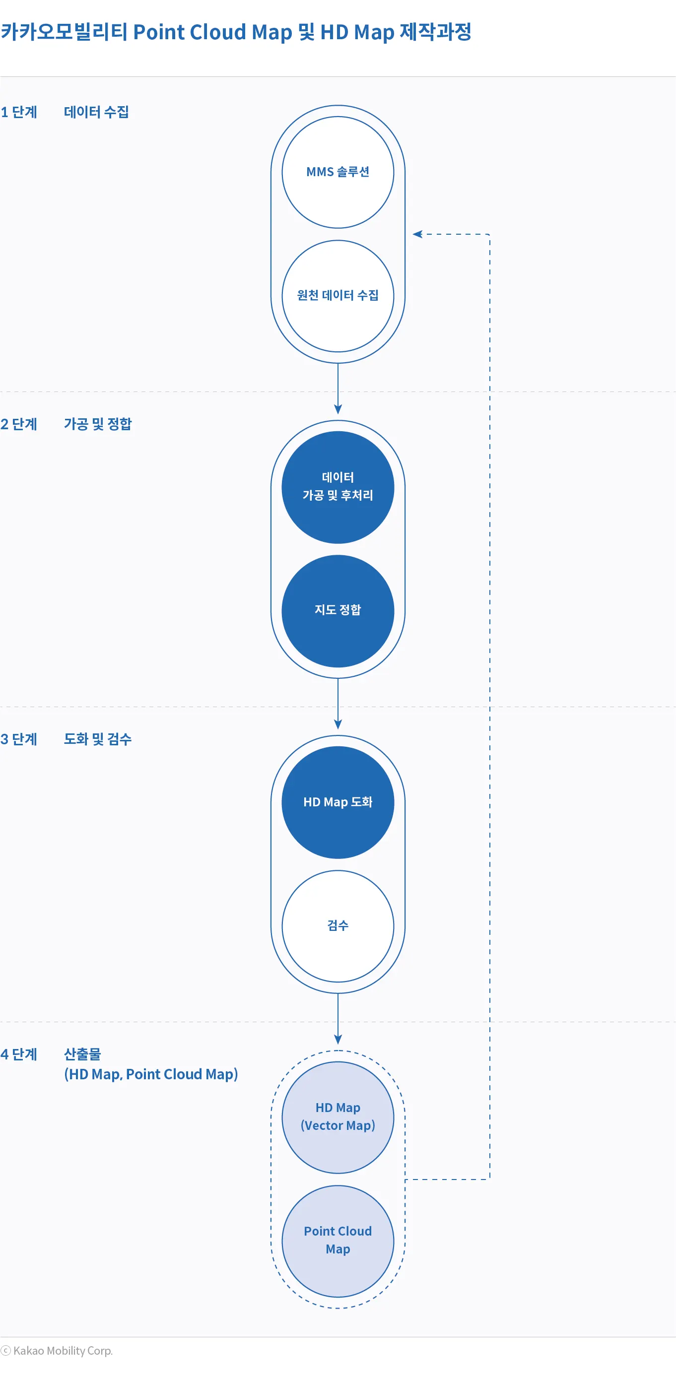 대부분의 지도제작 업체는 이러한 디지털 지도를 제작할 때 Navigation Map, ADAS Map, HD Map 각 지도 별로 포함하고 있는 정보와 정확도가 다르다는 점에서 각각의 지도를 따로따로 제작하고 있다. 이럴 경우 지도를 구축할 때마다 소요되는 비용과 인력은 가산이 된다. 하지만 카카오모빌리티는 하나의 원천 데이터(Point Cloud Data, 점군데이터)를 통해 각 지도 별 필요한 정보와 정확도를 추출 및 변형하여 사용할 수 있게끔 지도를 제작하고 있다. 카카오모빌리티의 Point Cloud Data 및 HD Map 제작 과정 다음과 같다.
