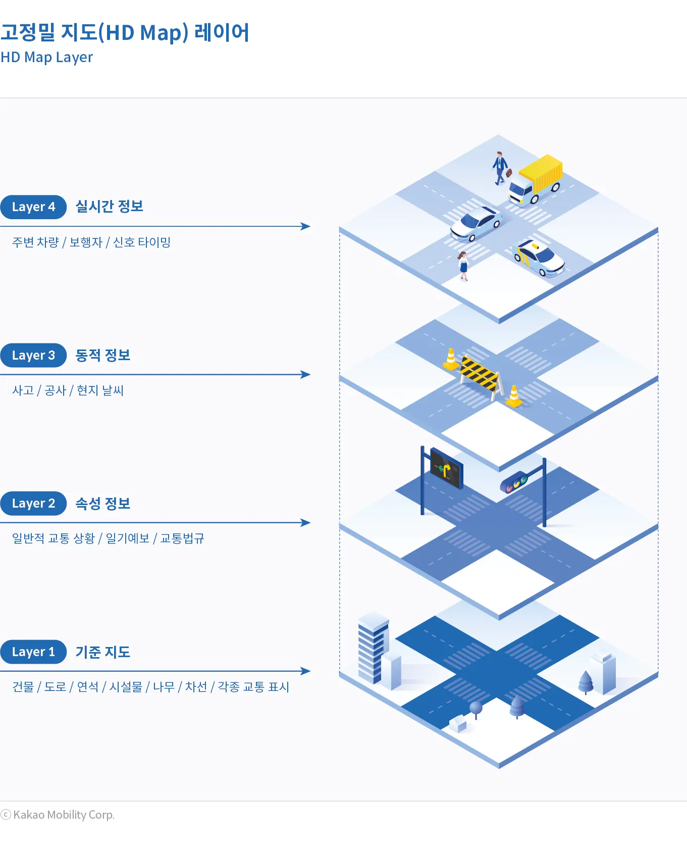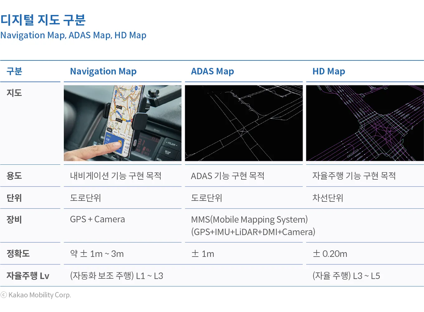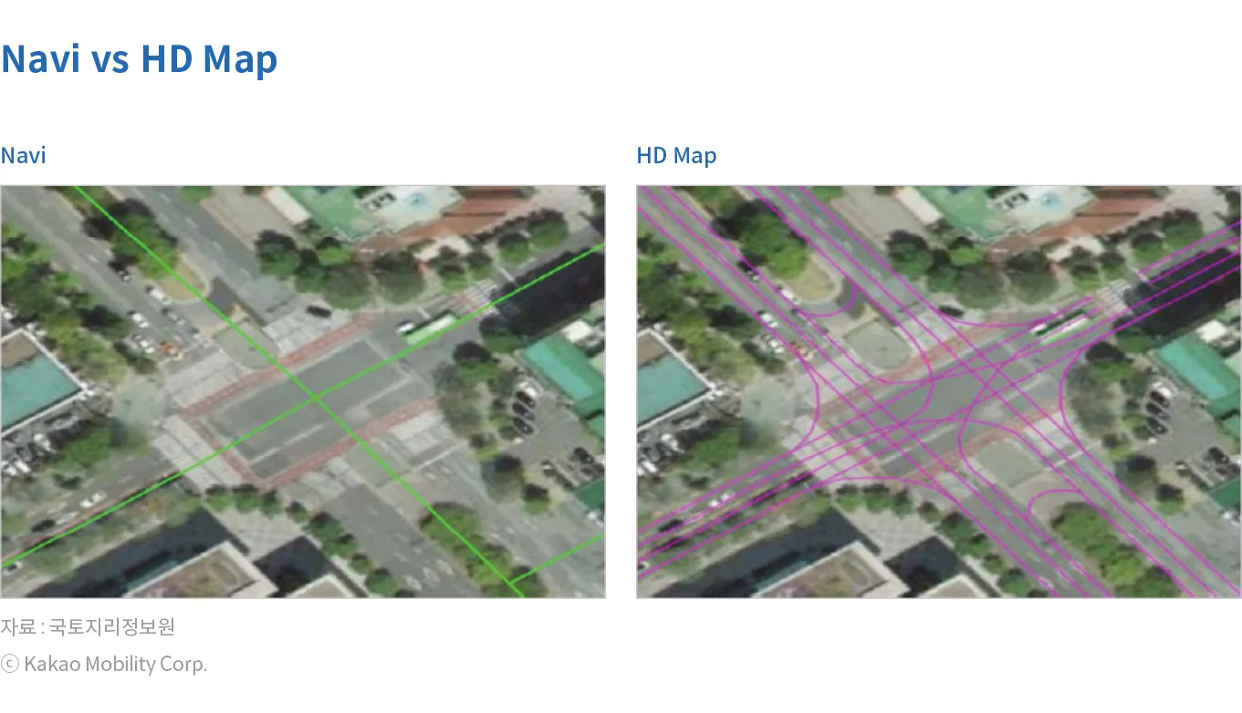 카카오모빌리티 디지털 트윈의 핵심 축 중 하나는 고정밀 지도 (HD Map) 구축이다. 쉽게 표현하자면, 고정밀 지도 (HD Map)는 기계(AI)를 위한 내비게이션 지도이다. 우리가 현실 세계에서 접하고 있는 물리적 공간을 자율주행 이동체를 위해 수 센티미터(cm) 수준의 오차범위로 가상의 공간에 구축해놓은 3D 입체 지도이다. 카카오모빌리티는 고정밀 지도 (HD Map)를 구축하기 위해 MMS(Mobile Mapping System)와 자동화 알고리즘을 자체 기술로 직접 개발하였고, 그 결과 매우 효율적으로 특고품질의 데이터를 양산하고 있다. 또한, 이미 카카오모빌리티에서 운영 중인 서비스를 통해 다양한 데이터를 활용하여 고정밀 지도 데이터를 업데이트하여 실시간으로 동적 환경까지 반영할 수 있는 Local Dynamic Map을 구축하고 있다. 디지털 지도의 경우 정확도와 그 용도에 따라 구분을 할 수 있다.