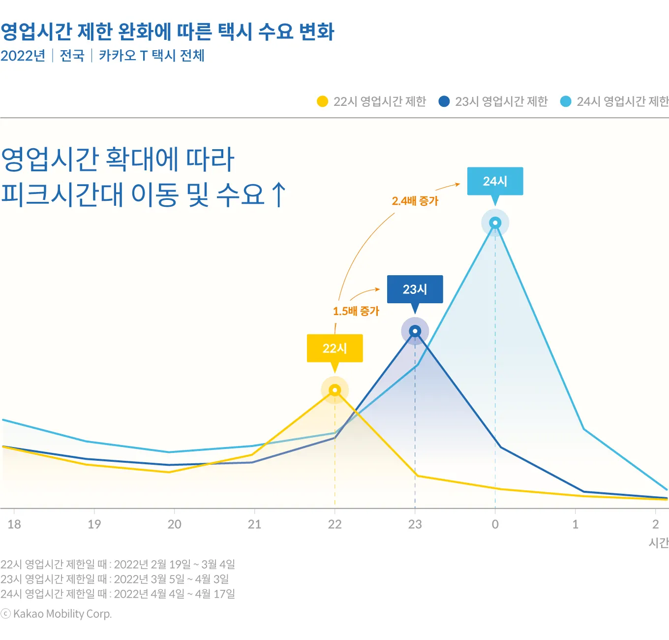 가장 쉬운 예로 코로나19로 인한 방역정책이 택시 수요에 미친 영향을 살펴보자. 사회적 거리두기 완화에 따른 영업시간 제한 조정은 택시 수요에 즉각적으로 커다란 영향을 미쳤다. 2022년 2월 22시 영업제한이 시행되던 시기에 맞춰 22시에 형성되었던 피크타임은 영업제한 시간이 23시로 완화되자 기존보다 1시간 뒤로 바로 바뀌었다. 피크타임 시간대만 이동한 것이 아니었다. 영업제한 시간이 22시에서 23시로 조정되자 피크타임 택시 호출량은 22시 피크타임의 1.5배나 증가하였다. 2022년 4월 영업제한 시간이 24시까지로 조정되자 피크타임도 24시로 이동함과 동시에 택시 호출량은 22시 피크타임의 2.4배까지 급증하였다. 불과 2달 사이에 택시 수요의 피크타임은 22시에서 23시를 거쳐 24시로 빠르게 이동하였고, 피크타임 택시 호출량은 2배 이상이 급증한 것이다.