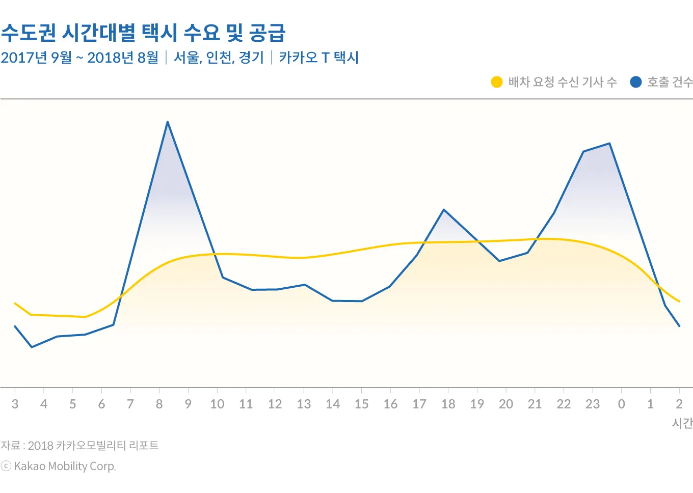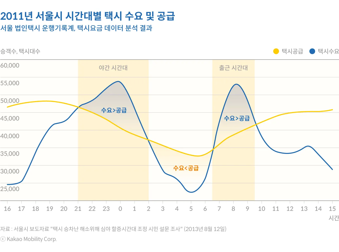 택시 플랫폼이 도입된 이후에도 택시 승차난은 완전히 해결되지는 못했다. 2018년 카카오모빌리티 리포트에서 수도권 택시 호출 데이터를 분석한 결과에서는 출근시간대, 심야시간대에 더해서 퇴근시간대에 택시 공급부족 현상을 확인할 수 있었다. 택시 승객(수요)과 기사(공급)를 효율적으로 연결해주는 택시 플랫폼이 활성화되면서 기존에 운행을 꺼리던 단거리 호출과 수요가 급증하는 시간대의 도심 지역 배차 성공률이 해마다 높아졌다. 하지만 수요와 공급의 효율적 연결만으로 피크타임의 절대적인 택시 공급 부족을 해소하기는 여전히 한계가 있었다.