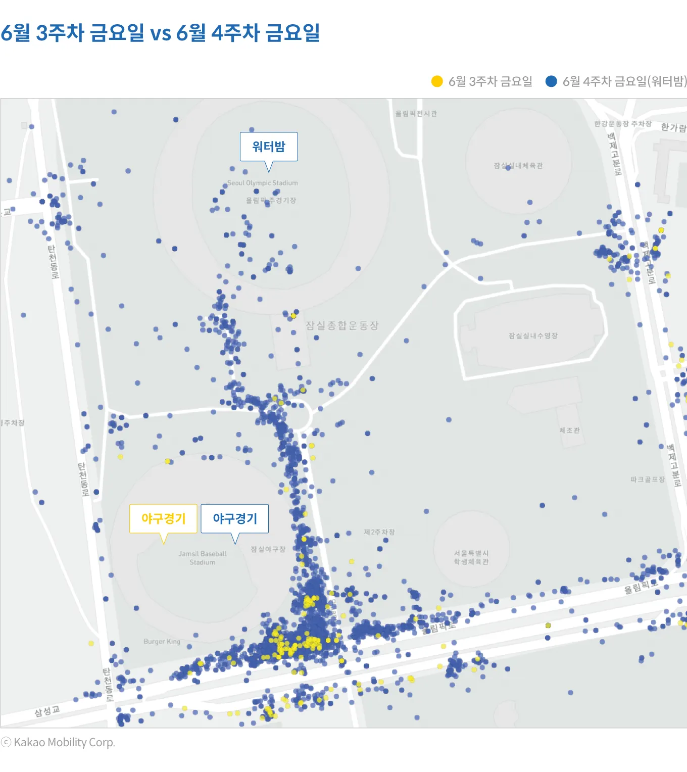 워터밤 공연이 열렸던 3일간 잠실종합운동장의 택시 호출의 지리적 분포도 택시 수요의 변화를 잘 보여준다. 1주일 사이 택시 호출량이 1608%가 급증한 금요일을 살펴보자. 야구경기만 열렸던 6월 3주차 금요일에는 야구장 인근의 지하철역에 택시 호출이 집중된 모습(노란색 점)을 확인할 수 있다. 반면, 야구경기와 함께 워터밤이 열렸던 6월 4주차 금요일은 택시 호출(파란색 점)이 잠실종합운동장 전체로 확대되었다. 행사가 끝난 이후 바로 이동을 선택한 관람객들이 행사장에서 미리 택시를 호출한 경우가 많았던 것이다. 또한, 잠실종합운동장 출구에도 택시 수요의 집중도가 높게 나타났다. 대중교통이 끊긴 심야시간까지 뒷풀이를 하던 다수의 관람객들이 이동 동선에 따라 가까운 대로변에서 귀갓길 택시 호출을 한 영향으로 보인다.