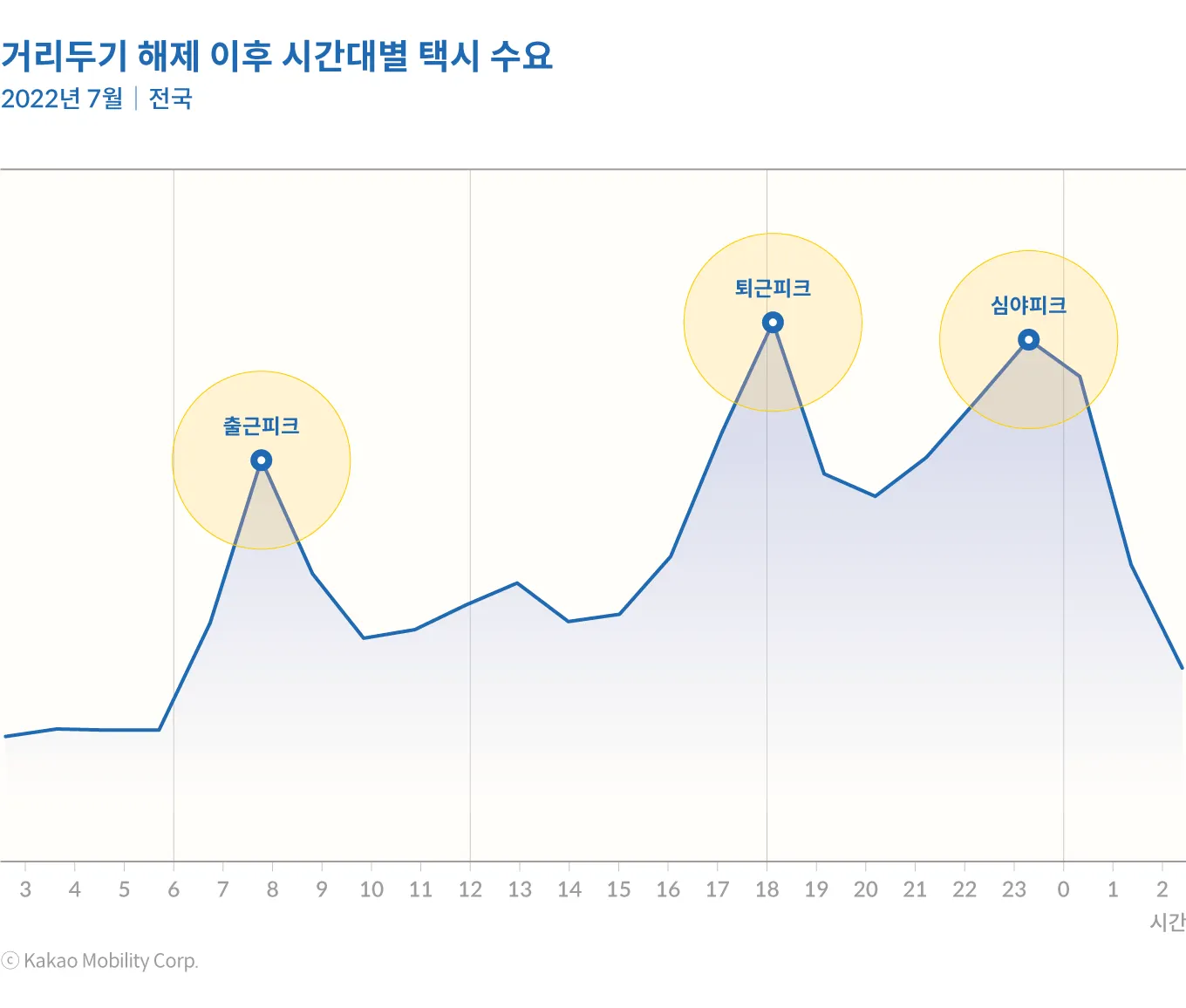 우선 택시 수요에 대해서 살펴보자. 하루 중에도 택시 수요의 등락폭은 매우 크다. 일반적으로 택시 수요는 사람의 이동이 증가하는 출근 시간, 퇴근 시간, 심야 시간대에 급증했다가 그 이외의 시간대는 급격하게 낮아지는 경향을 보인다. 이른바 피크타임 또는 첨두시간이라 불리는 시간대가 존재한다. 2022년 7월 한 달간 전국의 시간대별 택시 호출량을 보면, 오전 8시 전후 출근피크, 저녁 18시 전후 퇴근피크, 밤 23시 전후 심야피크가 형성되는 것을 확인할 수 있다. 사람들의 일상적 이동 패턴이 택시 수요에도 잘 반영된다고 볼 수 있다. 하지만 이는 특정 한 달 동안의 평균적인 경향일 뿐이다. 택시 수요는 정책, 날씨, 지역 행사 등 다양한 요소에 의해 영향을 받아 끊임없이 변화한다.
