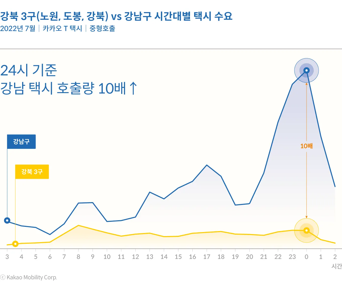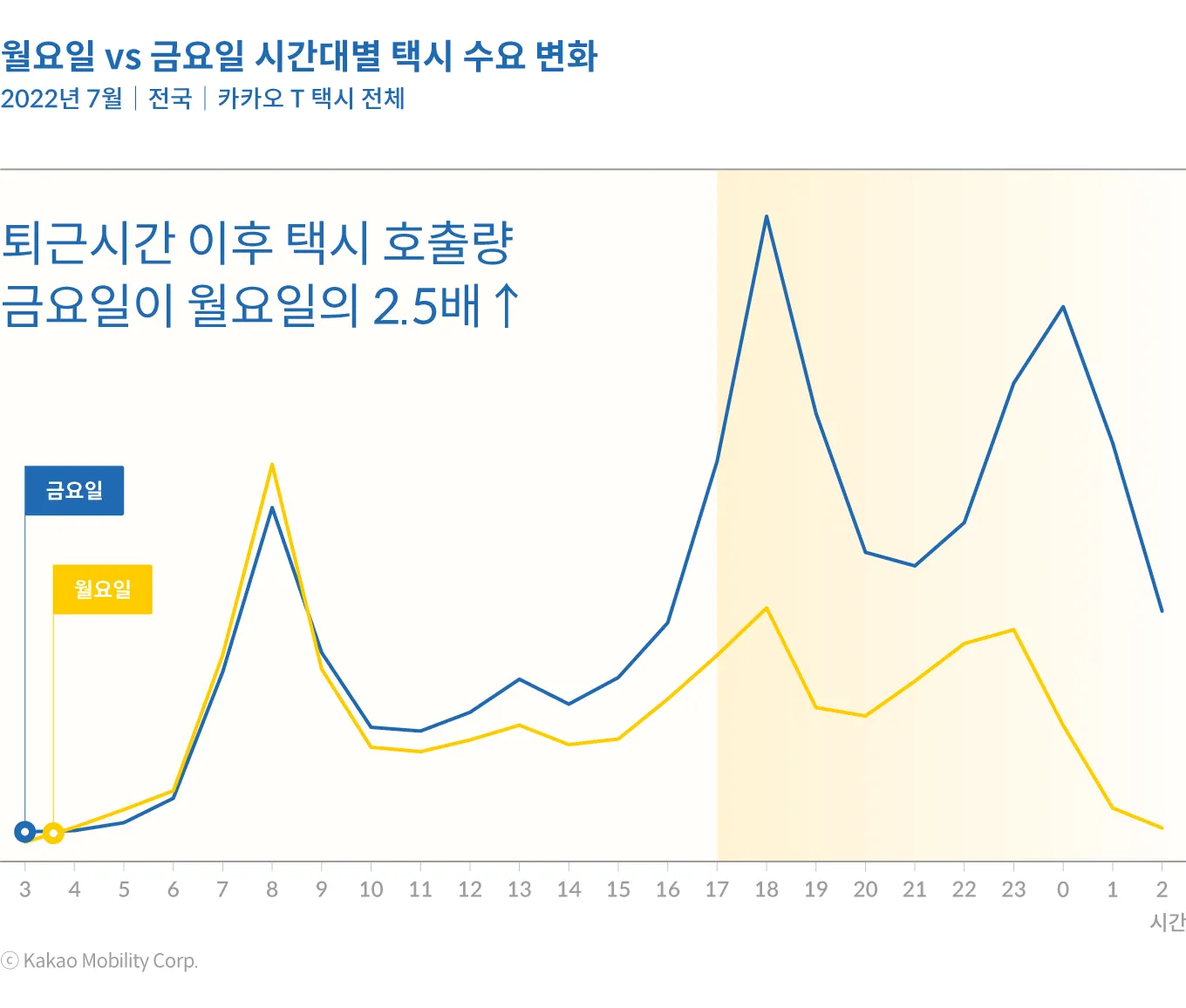 택시 수요는 사람들의 일상 변화와 함께 요동친다. 같은 평일인데도 ‘불금’의 택시 수요는 주말 직후인 월요일 저녁의 2.5배 이상이다. 같은 시간, 같은 도시 안에서도 위치에 따라서는 택시 호출량의 차이가 10배 이상인 것이 현실이다. 워터밤과 같은 대형 이벤트가 있을 경우 국지적으로 택시 수요가 집중되기도 한다. 택시 승차난이라는 문제의 해법을 찾기 위해서는 시간과 장소에 따라 천차만별인 택시 수요의 특성을 파악하고, 이에 부합하는 공급에 대한 고민도 이어져야 한다.