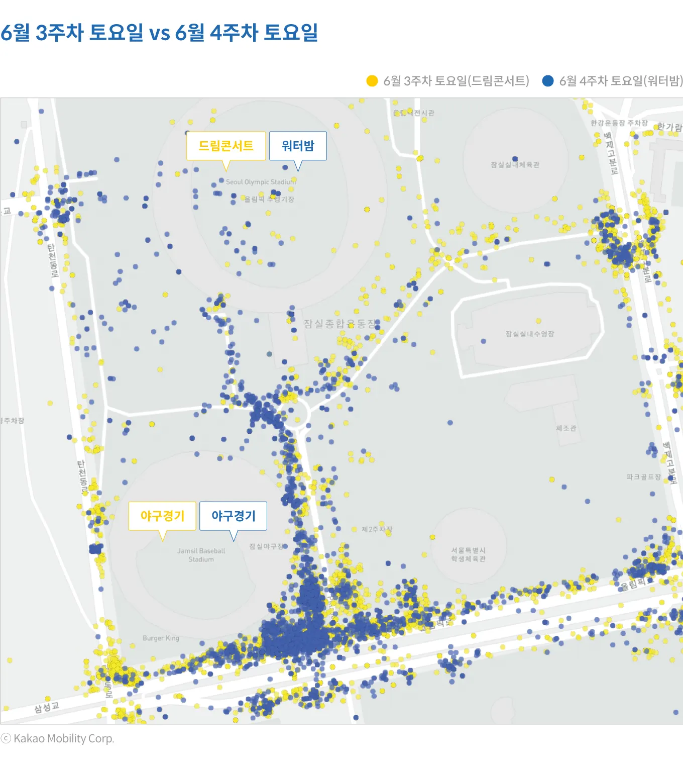 직전 주와 거의 유사한 택시 호출량을 보인 토요일의 택시 호출 분포는 금요일과는 정반대 양상이다. 6월 3주차 토요일에는 야구경기와 함께 올림픽주경기장에서 드림콘서트가 개최되었다. 드림콘서트가 끝난 이후 관객들이 택시를 호출한 영향으로 6월 3주차 택시 호출 분포(노란색 점)는 잠실종합운동장 전역에서 걸쳐 있다. 워터밤이 열린 6월 4주차 토요일의 택시 호출 분포(파란색 점)와 유사하게 공연이 끝난 이후 택시를 부른 관객들의 영향이 컸다.
