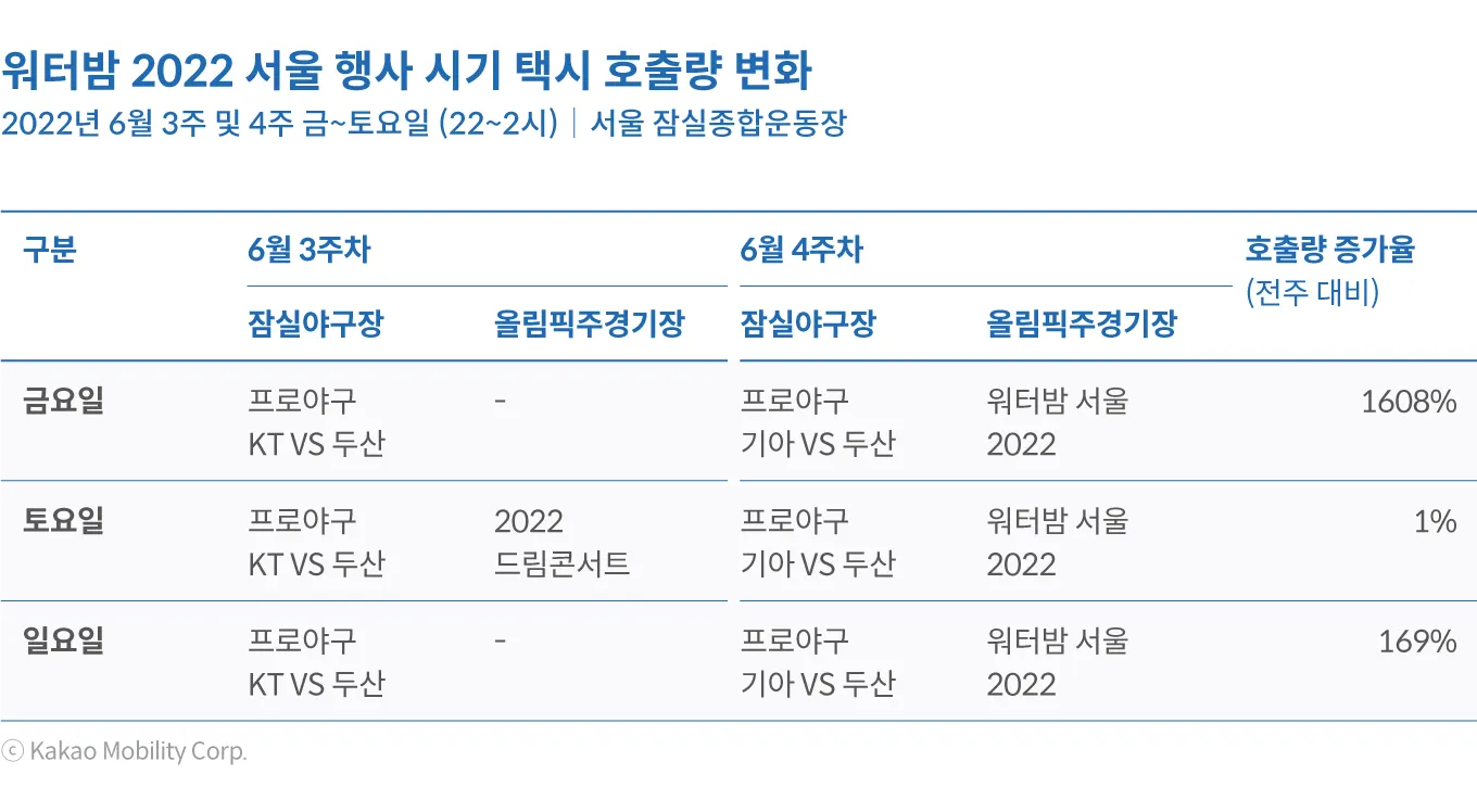 대형 이벤트가 며칠간 열리느냐에 따라서 택시 수요는 요동쳤다. 야구경기와 함께 워터밤 공연이 열렸던 6월 4주차 금요일 잠실종합운동장 일대의 택시 호출량은 야구경기만 열렸던 전주 대비 무려 1608%나 급증하였다. 반면, 직전 주에 드림콘서트가 개최되었던 토요일 택시 호출량의 증가율은 전주 대비 0.99%로 사실상 변화가 미미했다. 워터밤 만큼이나 드림콘서트에 다수의 인파가 몰리면서 높은 수준의 호출량이 토요일 1주 간격으로 지속된 결과다. 워터밤 마지막날인 일요일에는 택시 호출량이 다시 전주대비 169%까지 급상승했다. 워터밤 공연 첫날인 금요일에 잠실종합운동장 일대에 택시 대란이 벌어졌다는 소식이 SNS를 통해서 이미 빠르게 퍼져나간 상황이었지만 택시 호출량은 전주 대비 2배가 증가했다.