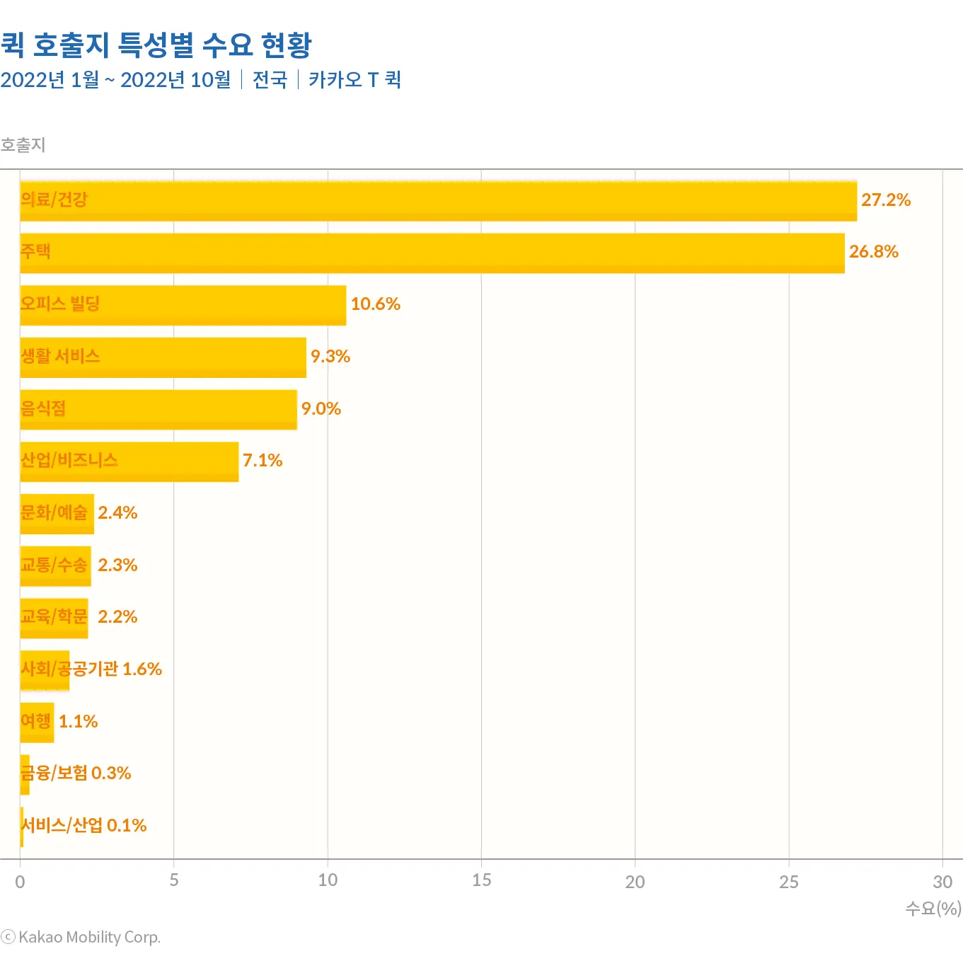 첫째, 아파트, 빌라 등 주거지가 포함된 ‘주택'이 26.8%로 호출지 중 두 번째로 높게 나타났다. 2022년은 코로나19 팬데믹으로 인한 ‘의약품 배송'(호출지: 의료/건강)이 많았다는 시기적 특성을 감안한다면 주택이 퀵 서비스 호출을 가장 많이 한 곳인 셈이다. 전통적 퀵 이용자인 기업 고객들의 호출지가 ‘오피스 빌딩', ‘산업/비즈니스', ‘사회/공공기관', ‘여행', ‘금융/보험' 등으로 다양하게 나누어져 있다는 점을 감안하더라도 카카오 T 퀵 서비스에서 ‘개인' 이용자가 차지하는 비중이 적지 않다는 점을 유추할 수 있다.