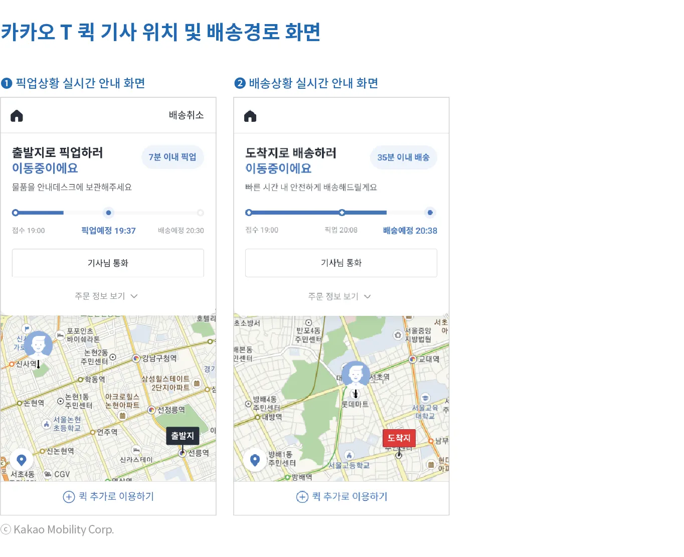 카카오 T 퀵의 또 다른 장점은 퀵 접수 직후부터 기사가 픽업하러 오는 경로와 예상 픽업 시간, 픽업 후 배송 현황, 배송 완료 예정 시간 등을 쉽게 확인할 수 있게 했다. 이는 고객들이 퀵을 전화로 호출했을 때 수시로 기사에게 전화해 기사의 위치와 배송 상황과 완료 여부를 확인해야 하는 일을 줄이고, 일에 집중할 수 있도록 한다.