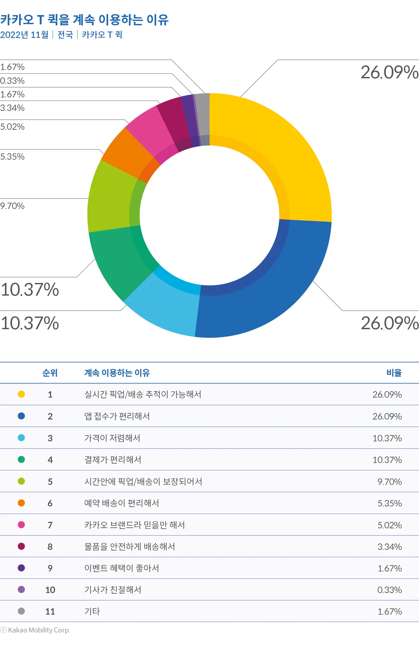 최근 카카오 T 퀵을 자주 이용하는 고객을 대상으로 진행한 설문 조사 결과, 앱을 통한 편리한 접수(26.1%)와 실시간 픽업/배송 추적(26.1%)에 대한 만족이 높다는 것을 알 수 있었다. 그다음으로 가격이 저렴해서 (10.4%), 결제가 편리해서(10.4%), 원하는 시간 안에 픽업/배송이 보장되어서 (9.7%) 등으로 확인됐다.