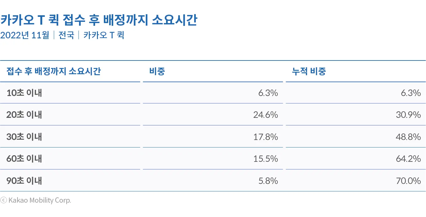 카카오 T 퀵은 빠른 배정과 정확한 배송 시간 안내, 배송 추적 기능도 기존 퀵 서비스 시장과 차별화된 장점이다. 카카오 T 퀵 이용 과정은 다음과 같다. 결제 수단을 등록한 뒤 출/도착지 입력, 보낼 물건 사이즈 선택, 가격 조회 등을 한 뒤 상품을 골라 호출을 하면 된다. 이 전체 과정이 평균 2분 30초 정도로 매우 짧다. 한 번 이용하고 난 뒤에는 호출까지 걸리는 시간이 더 짧아진다. 결제 수단은 한 번 등록하면 다시 입력할 필요가 없고, 한 번 입력한 출발지나 도착지는 기록이 남아 있어 선택만 하면 된다. 이용자들의 사용 기록을 보면 거의 절반(48.8%)에 달하는 이용자들이 30초 내에 기사가 배정되는 경험을 하고 있다.