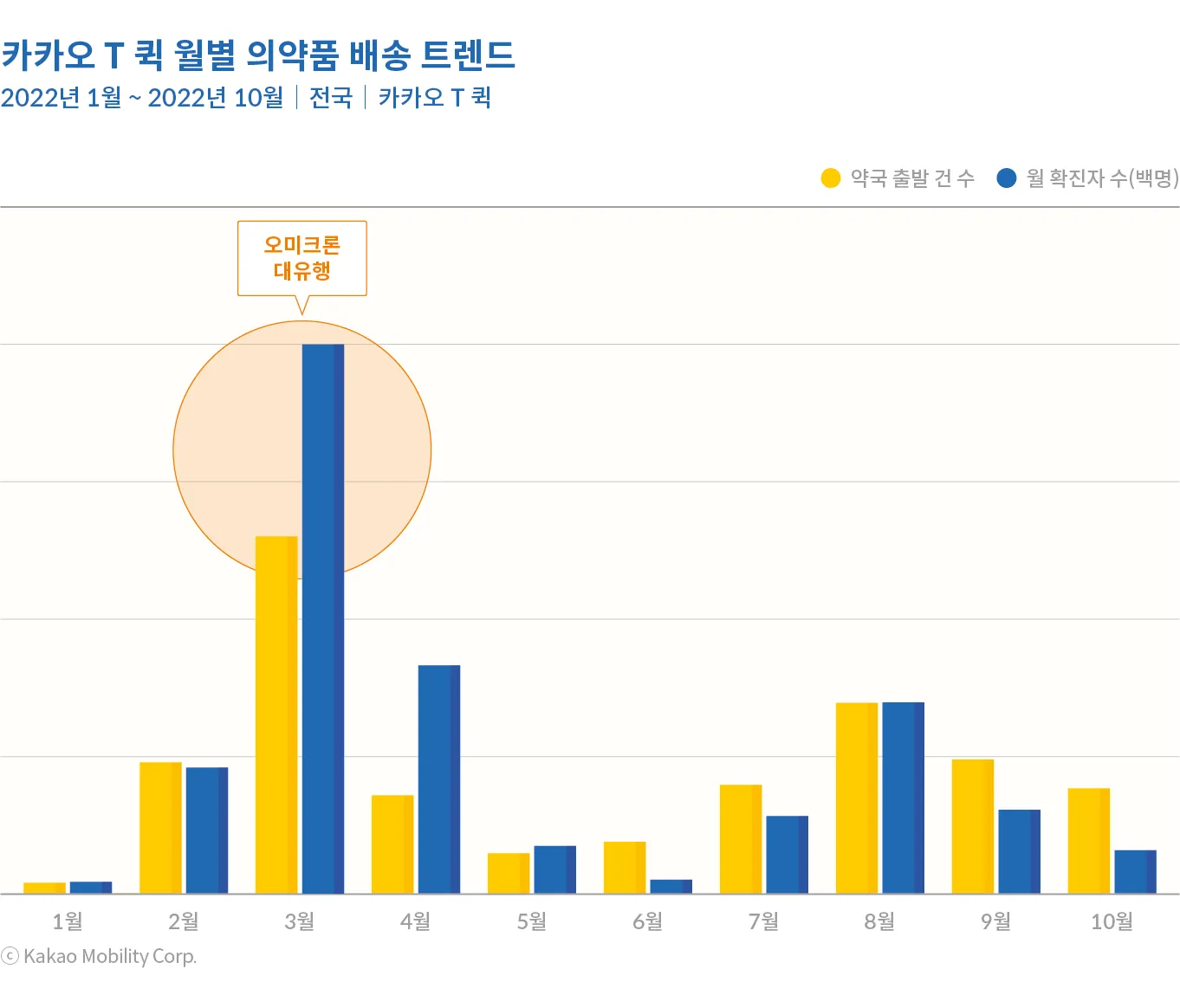 2022년 카카오 T 퀵 서비스 통계의 가장 큰 특징은 ‘의약품 배송'이다. 코로나 19 팬데믹으로 인한 예외적 특성이 강하게 나타난 해다. 오미크론 변이로 인해 확진자가 급증했던 2~3월에 약국에서 출발하는 배달 수요가 가장 많았다. 코로나19 월별 확진자 수와 의약품 배송 호출 수 트렌드가 비슷하게 나타났다.