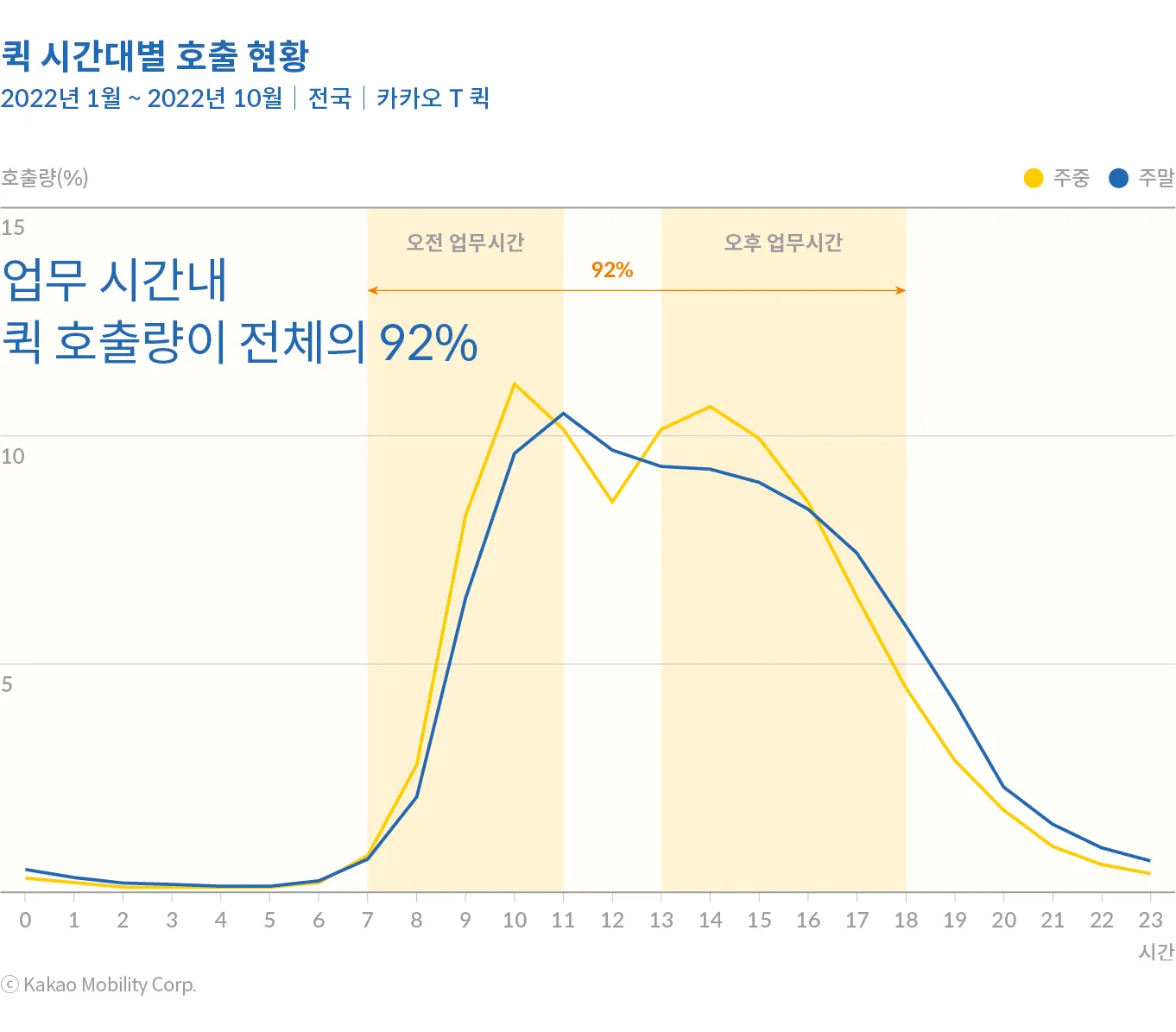 퀵 서비스는 전통적으로 기업 고객 위주의 시장이다. 회사에서 급하게 서류를 보내야 할 때 오토바이로 이동하는 퀵 서비스가 중요한 역할을 해왔다. 그래서 공간적으로는 회사가 많은 상업 지구에서, 시간적으로는 주중 근로 시간에 호출이 많다.