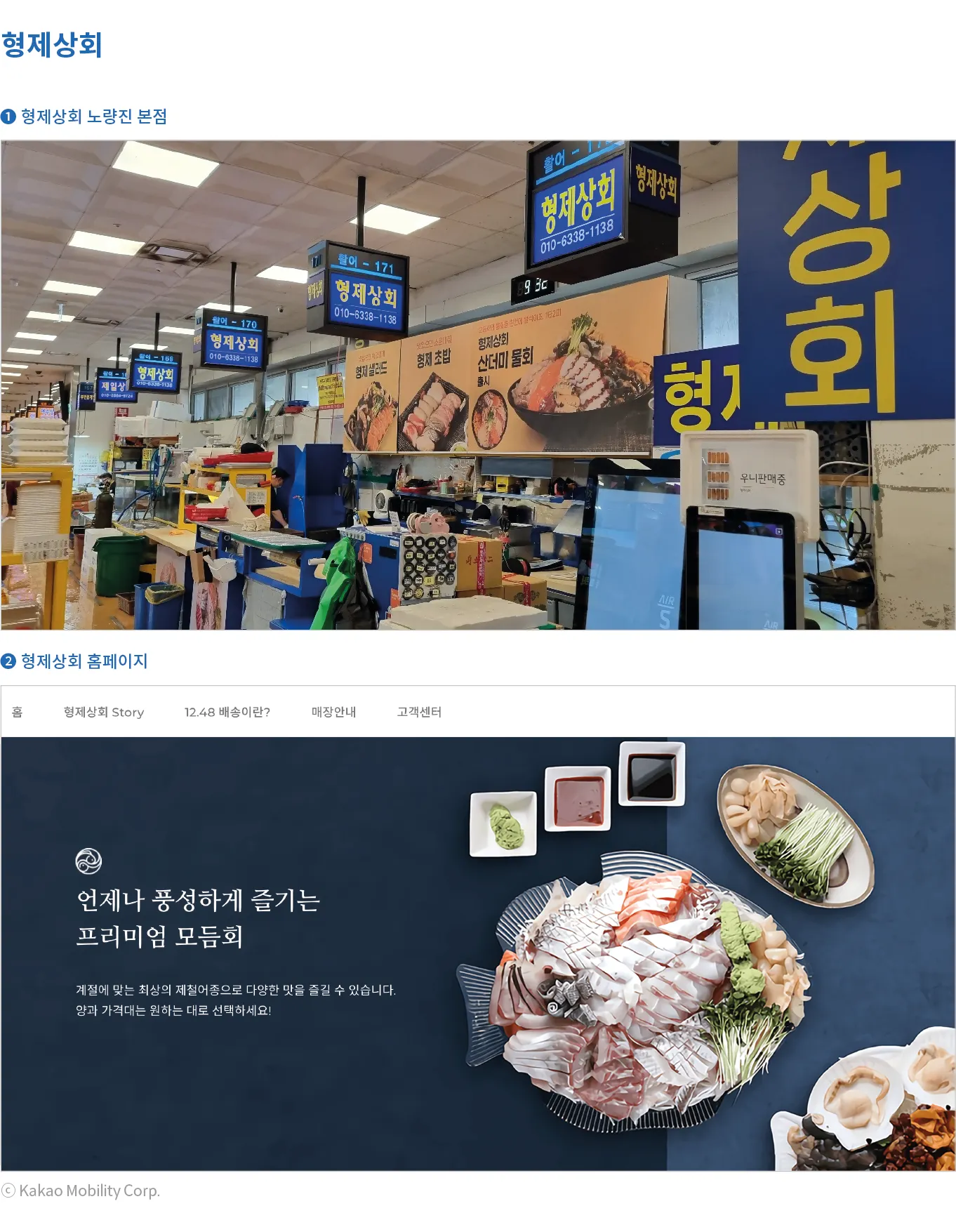 모듬 활어회로 유명한 노량진 수산시장의 형제상회는 홈페이지를 통해 매일 활어회 주문을 받는다. 형제상회는 주변 가게들과 달리 음식 배달 앱을 통해 주문받지 않고, 카카오 T 퀵과 API를 연동한 자체 홈페이지로 주문을 받는다. 고객이 원하는 시간에 맞춰 배달될 수 있도록 퀵 호출부터 기사 배정, 기사의 픽업과 배송까지 자동으로 연결된다.