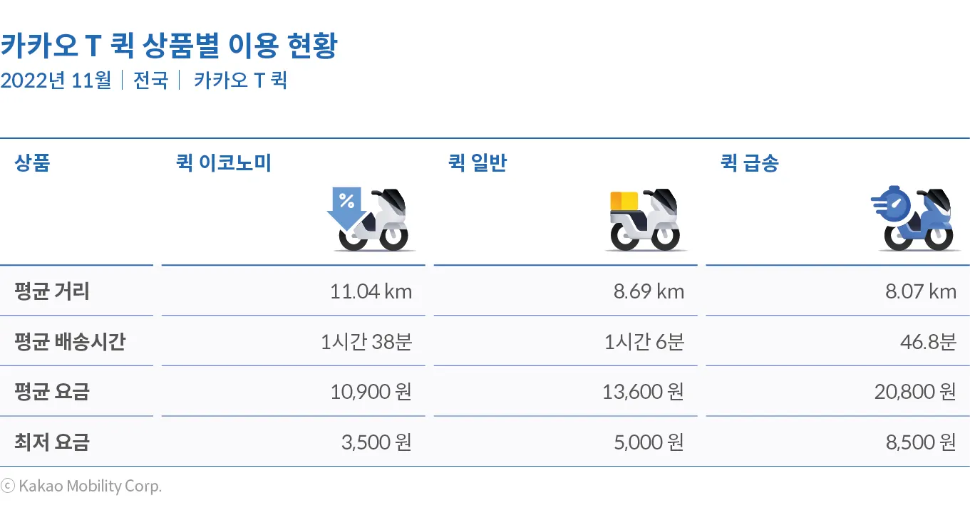 카카오 T 퀵 이코노미는 가격 경쟁력 있는 가성비 퀵으로 반나절 내 배송할 수 있는 상품이다. 급하지 않고 반나절 내에만 도착해도 된다면 ‘이코노미’ 상품이 경제적이다. 이코노미는 단거리보다는 거리가 멀수록 가격이 부담되는 중/장거리에서 이코노미 퀵 이용 비중이 높다. 상품별 장거리 이용 비중을 보면 급송 13%, 일반 퀵이 17% 인 반면 이코노미에서는 28%이다. 이코노미 퀵의 이용 현황을 보면 평균적으로 11km 거리를, 10,900원 비용으로 1시간 38분 정도에 배송이 완료된다.