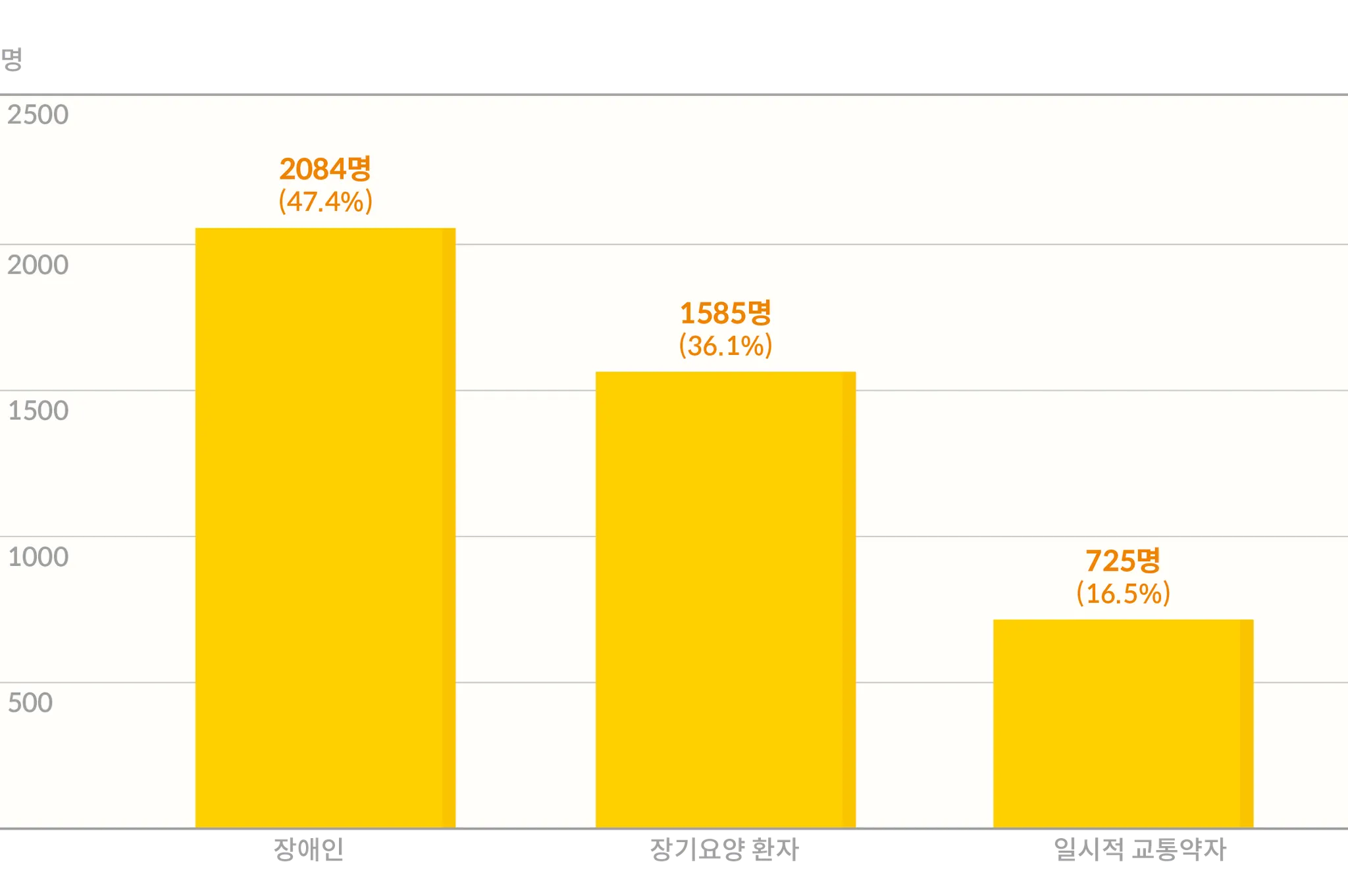 그다음으로는 장기요양이 필요한 환자분들의 이용이 36.1%인 1585회로 집계됐어요. 이 서비스가 일상 속 필수적인 활동들을 가능하게 하고 있다는 것을 보여주는 중요한 수치입니다. 마지막으로 일시적인 교통약자 분들이 이용한 횟수는 725회로 전체의 16.5%를 차지했네요. 이는 갑작스러운 부상이나 다른 상황으로 일시적으로 이동에 어려움을 겪는 분들께도 큰 도움이 되고 있다는 걸 의미해요.