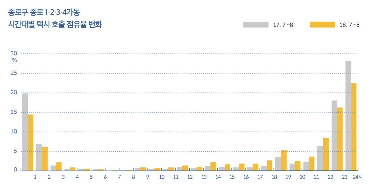 정책 시행전과 비교하여 퇴근시간 이후의 택시 이용 패턴의 변화와 여가시설로 향하는 호출량의 증가를 보면 어느정도 직장인들의 생활의 변화를 미뤄 짐작할 수 있습니다.