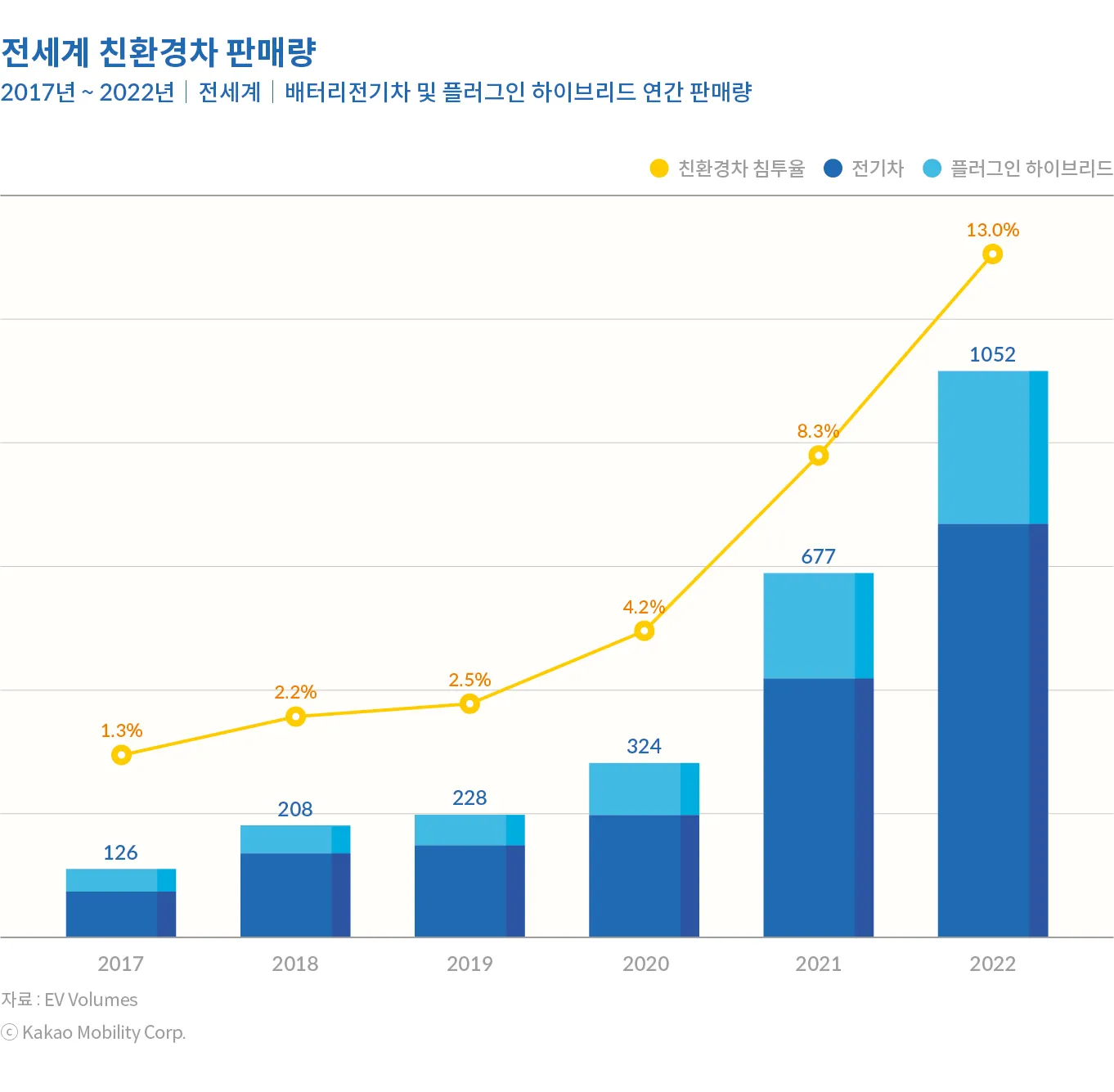 친환경차의 보급속도도 팬데믹 기간 동안 변곡점을 지나가고 있다. 2021년 친환경차 판매량은 전년대비 2배 이상 증가하였고, 2022년에는 글로벌 친환경차 판매량이 처음으로 1000만 대를 넘어서면서 신차 시장의 13.0%까지 점유율이 높아졌다. 글로벌 자동차 시장의 신차 10대 중 1대 이상이 이미 전기차, 플러그인 하이브리드 자동차 시장이 된 것이다. 전 세계 내연기관차 판매가 주춤하는 가운데 친환경차 판매량이 고성장하면서 전기차 점유율은 지속적으로 높아질 것으로 예상된다.