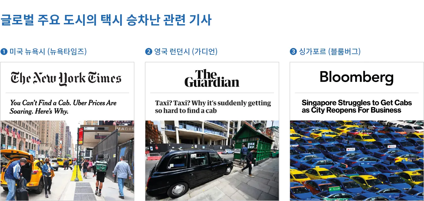 코로나19 팬데믹으로부터 일상 회복이 본격화되면서 전 세계 주요 도시에서 ‘승차 대란’이 발생하였다. 미국 최대 도시 뉴욕은 택시 승차난과 우버, 리프트 등 승차공유 서비스의 요금 급등이 이슈가 되었다. 영국과 싱가포르에서도 일상 회복 이후에 택시 승차난 문제가 제기되었다.
